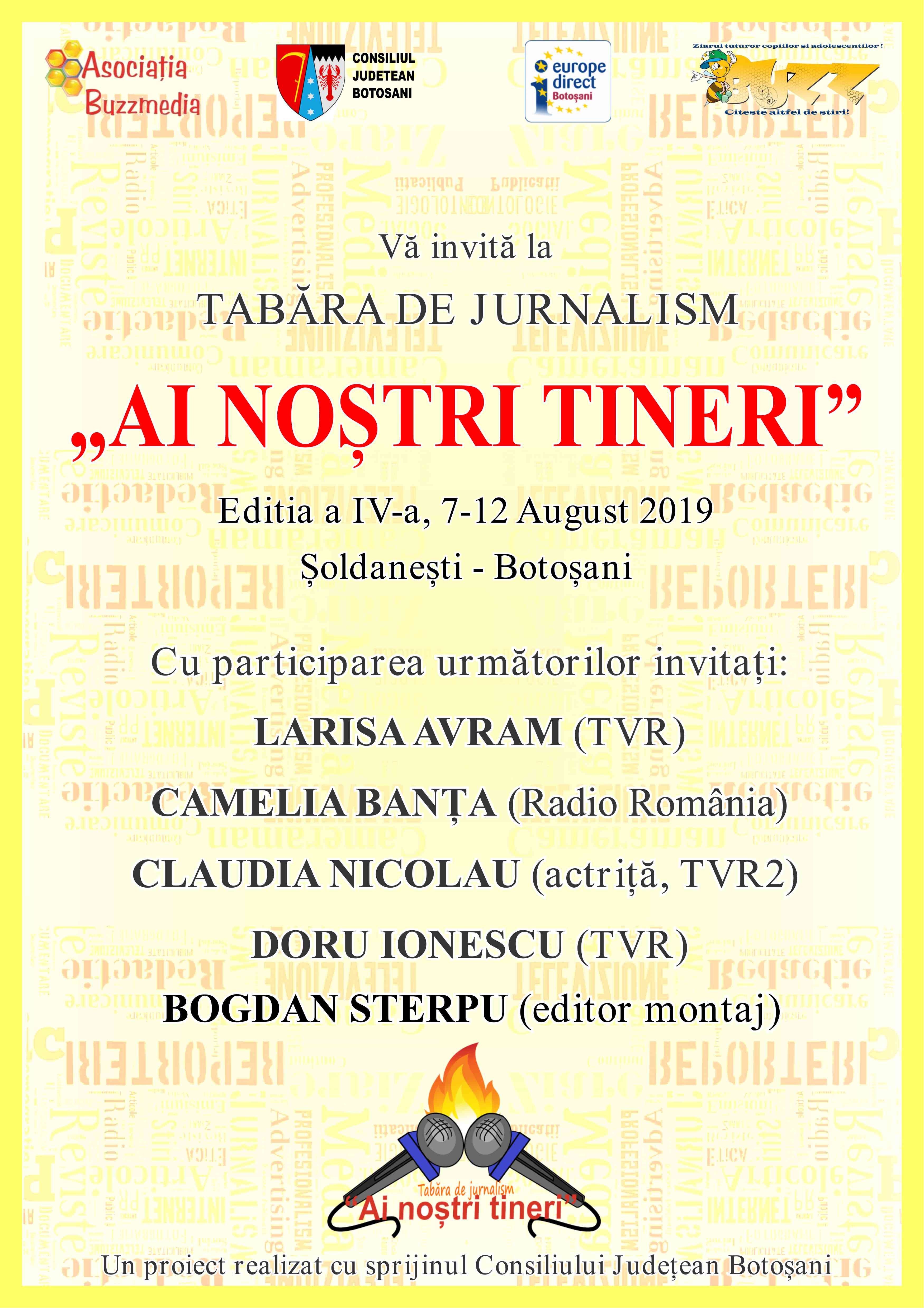 În perioada 7-12 august 2019, la Șoldănești, va avea loc cea de-a IV-a ediție a taberei de jurnalism “Ai noștri tineri”, un proiect realizat de Asociația Buzzmedia, cu sprijinul Consiliului Județean Botoșani, având ca partener Europe Direct Botoșani. A patra edițe își propune, cu sprijinul trainerilor invitați, inițierea participanților, copii și adolescenți cu vârste peste 10 ani, în zona reportajului de televiziune și al radioului, precum și al documentarului tv.