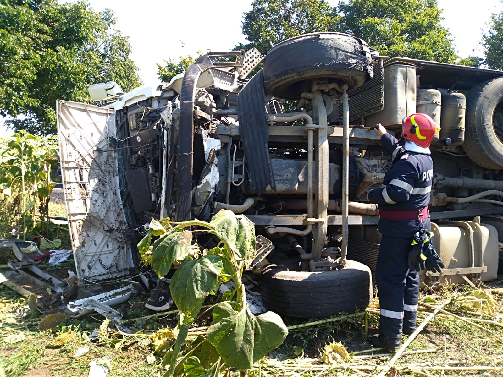 FOTO Accident! Un camion s-a răsturnat pe un drum din Botoșani. Șoferul a fost rănit