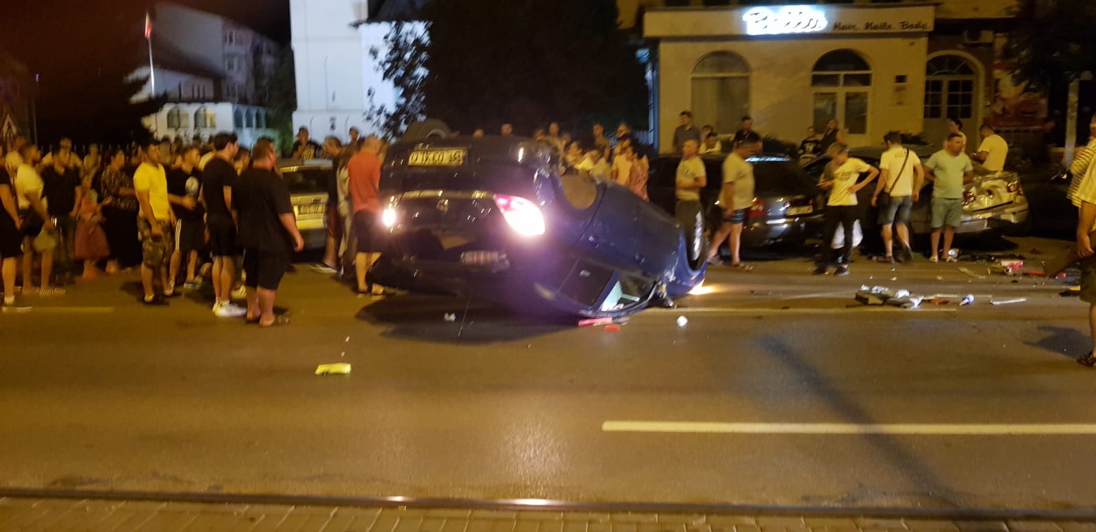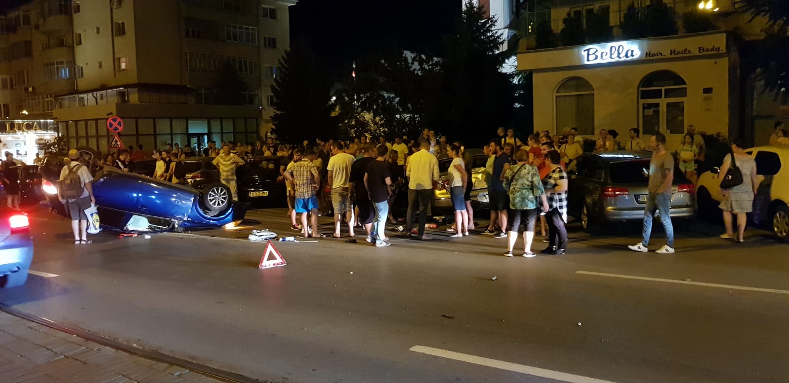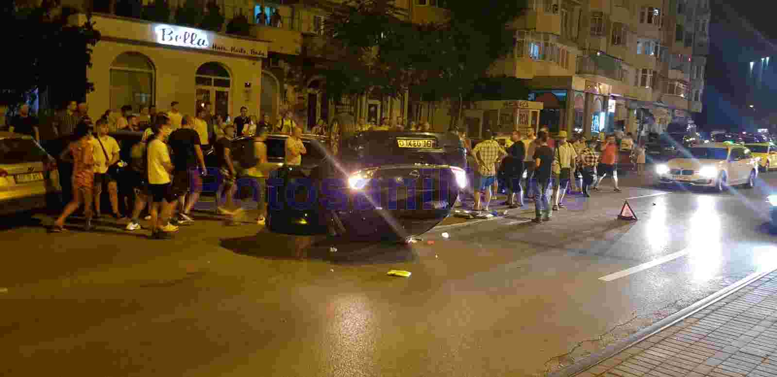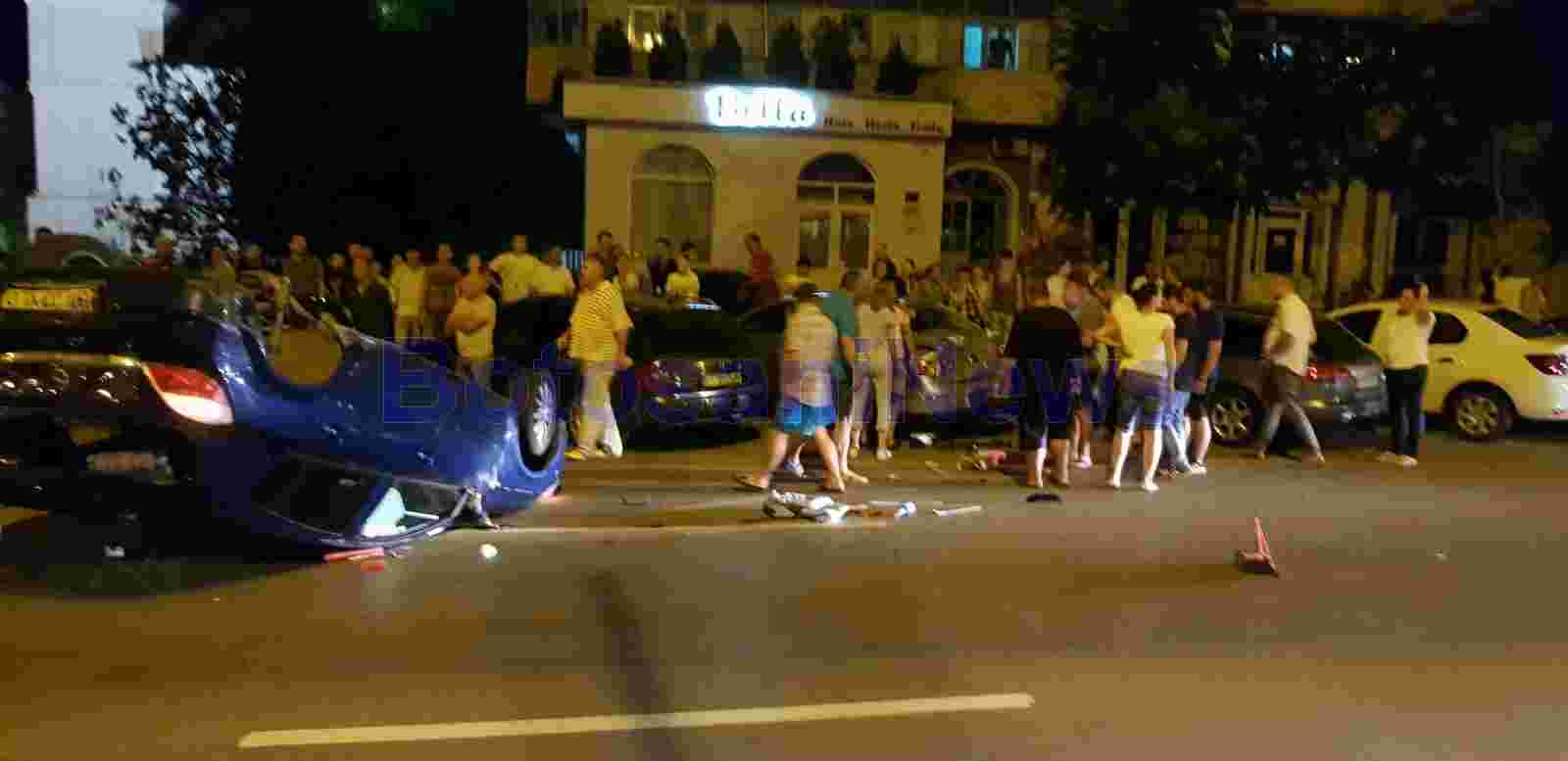 Ulterior, mașina răsturnată a lovit un Volkswagen care era parcat pe Calea Națională. În mașina răsturnată se aflau mai mulți tineri, iar doi dintre ei au fost transportați la spital. La fața locului au ajuns pompieri, ambulanță SMURD, echipaje de poliție.