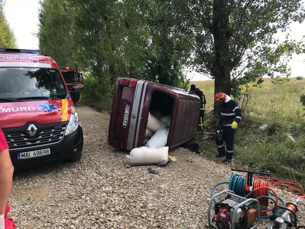 Accidentul s-a produs după ce un tânăr de 25 de ani, aflat la volanul unei autoutilitare încărcată cu saci cu cereale, pe fondul neadaptării vitezei în condiții de drum cu pietriș, a pierdut controlul acesteia, a intrat în balans, apoi s-a răsturnat pe o parte.