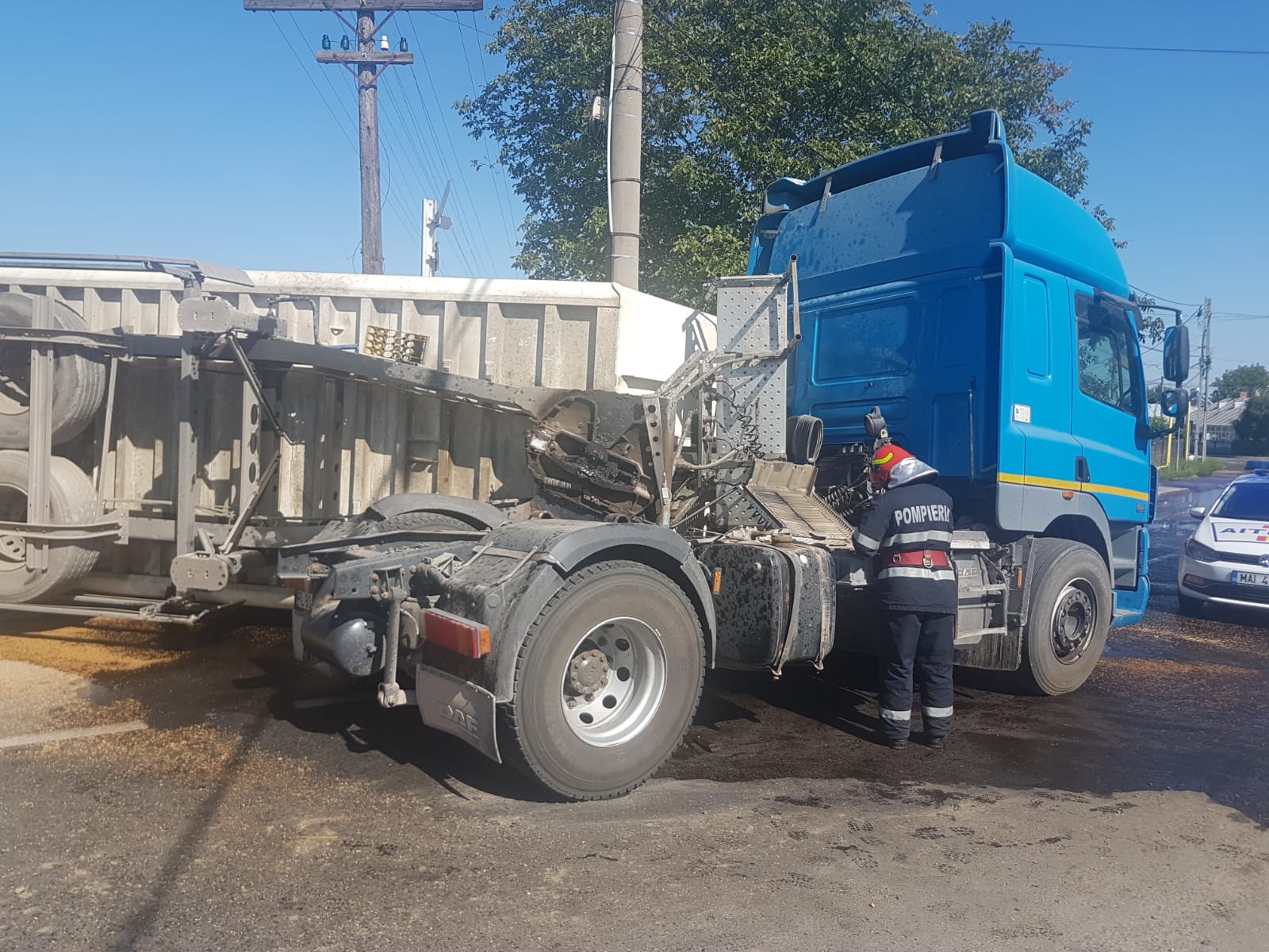 În urma impactului puternic, trenul a deraiat , iar remorca camionului s-a răsturnat.