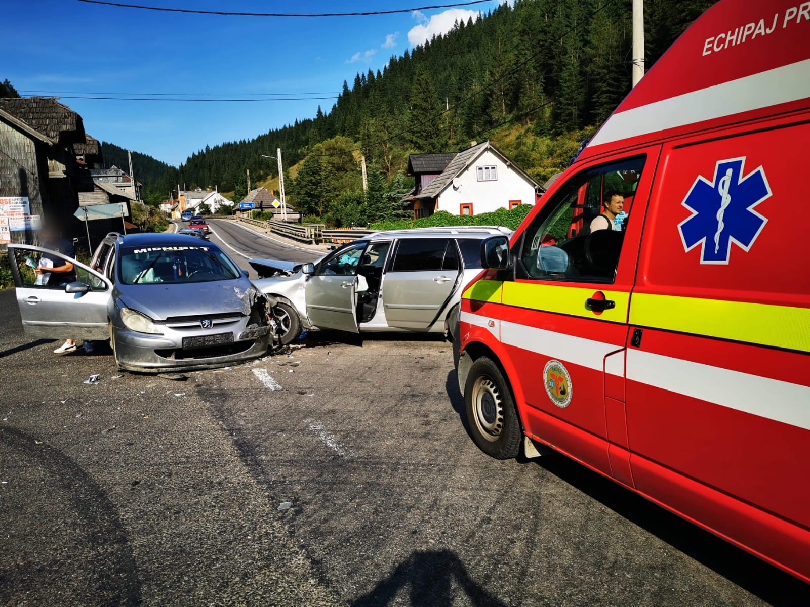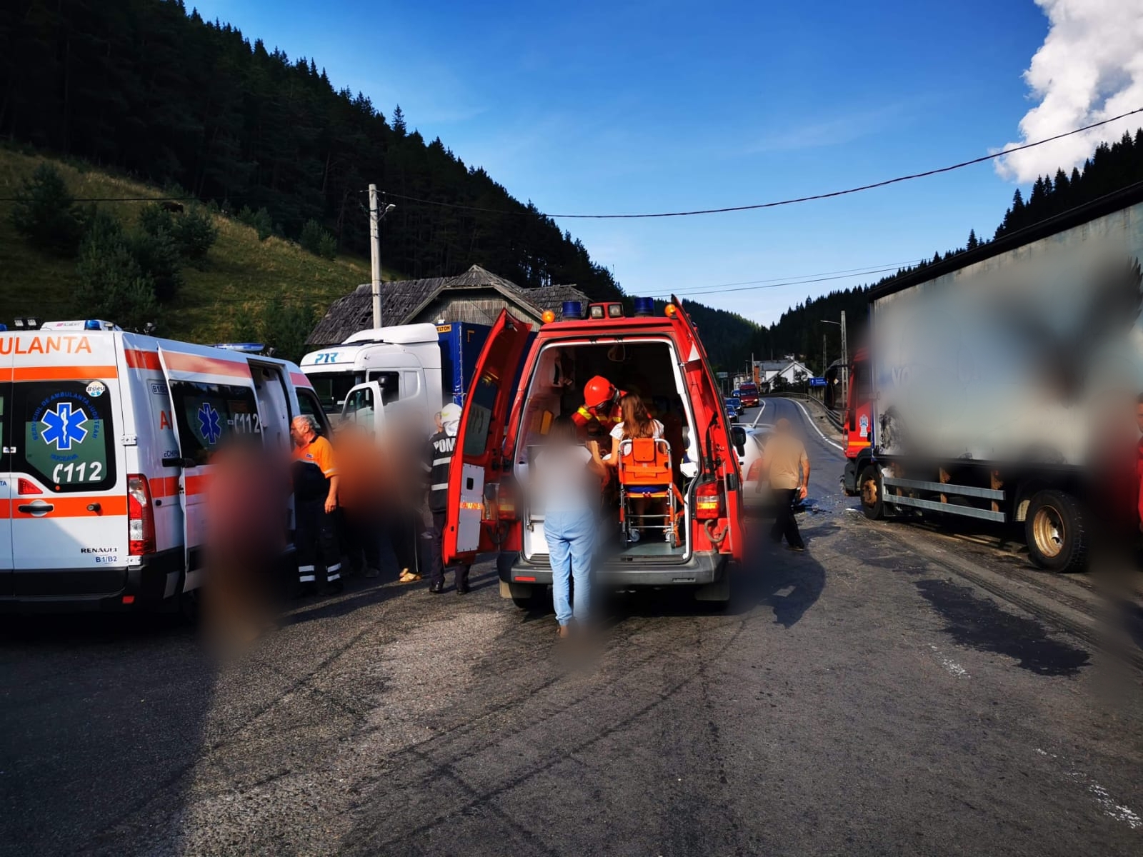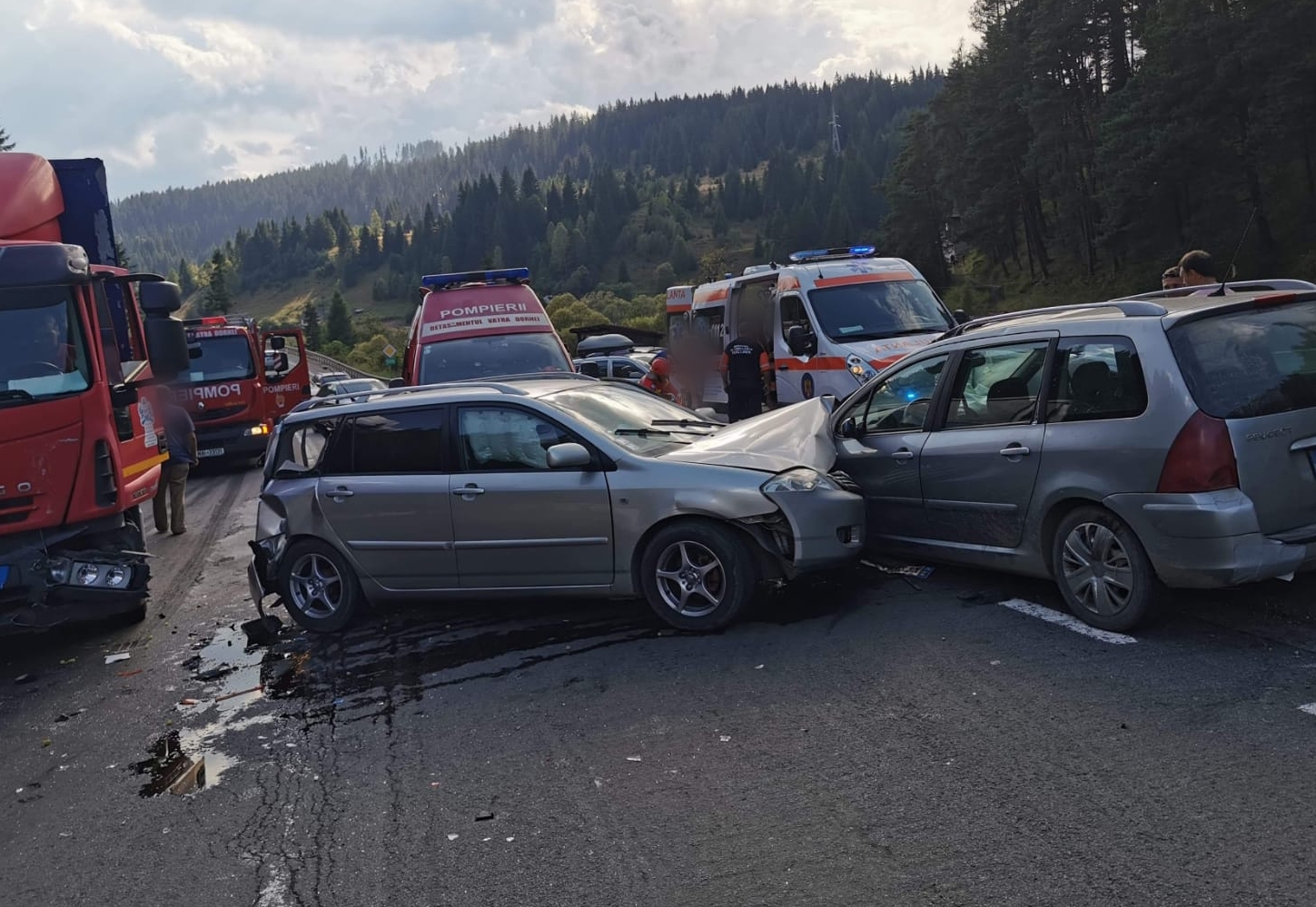 Din primele informații, zece persoane se aflau în mașini. Patru dintre ele, doi adulți și doi copii, au fost răniți și transportați la spital.