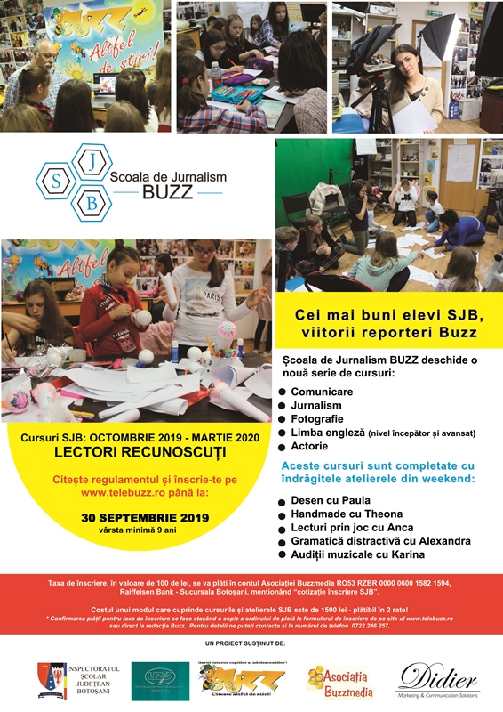 Școala de Jurnalism Buzz își deschide porțile pentru nouă promoție de copii care doresc să cunoască tainele meseriei de jurnalist. Până pe data de 30 septembrie se fac înscrieri pe siteul telebuzz.ro sau, direct, la redacția Buzz din strada Săvenilor nr. 2-8.