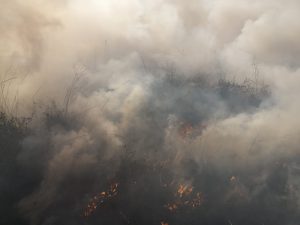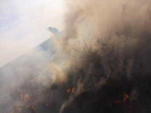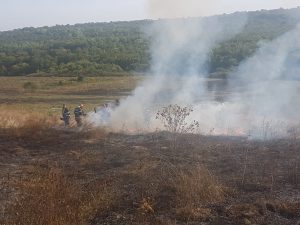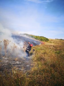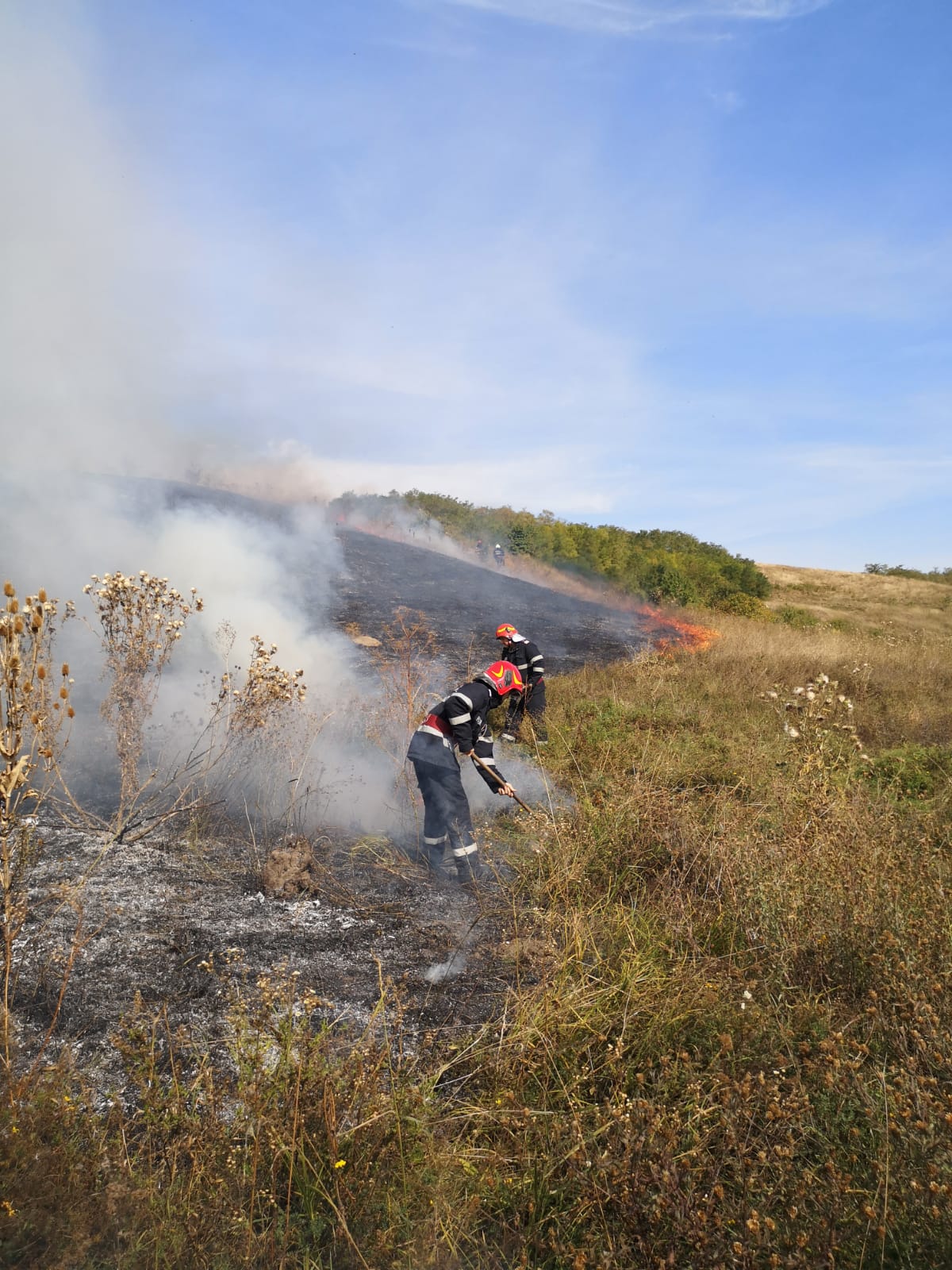 Intervenția este îngreunata de vegetație uscata înaltă de 1-1,5 m, de vântul care bate în rafale și favorizează extinderea flăcărilor, dar și accesul greu pentru autospeciale.