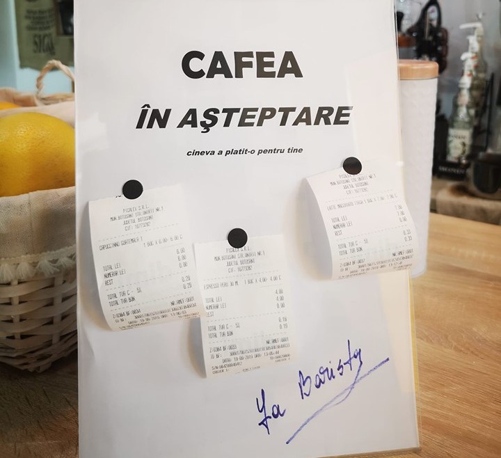 Un coffee shop din Botoșani a adoptat conceptul „Cafea în așteptare”, existent deja în marile orașe ale țării, precum Brașov, Cluj Napoca, Constanța, dar și în Capitală, după modelul italienilor. Coffee shop „La Barista” de pe Pietonalul Unirii a pus în aplicare deja acest demers, iar clienții sunt extrem de încântați.