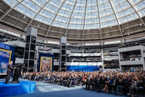 La intrarea în sala reuniunii, șeful statului a fost aplaudat de cei 1.500 de membri PNL, parlamentari şi aleşi locali care au participat, sâmbătă, la Craiova, la Adunarea Regională a organizaţiilor PNL din Oltenia. Drumul spre tribuna sălii a fost un nou prilej pentru o baie de mulțime, liberalii dorind să dea mâna, să facă fotografii și să le ureze succes președintelui României și liderului PNL.