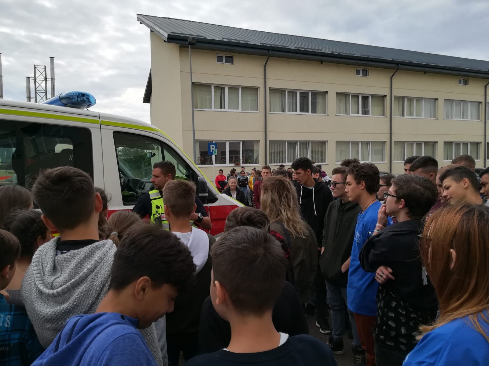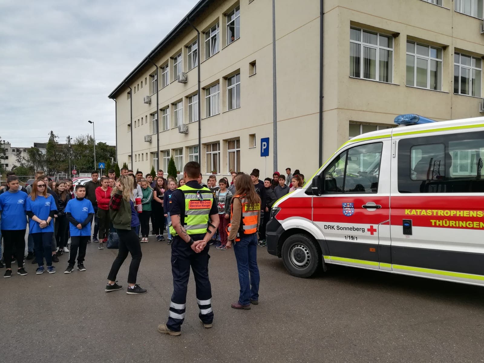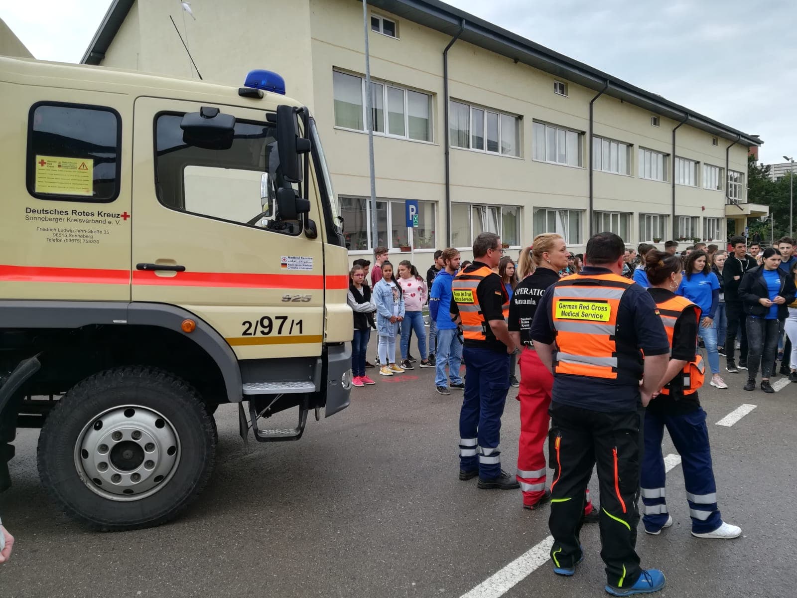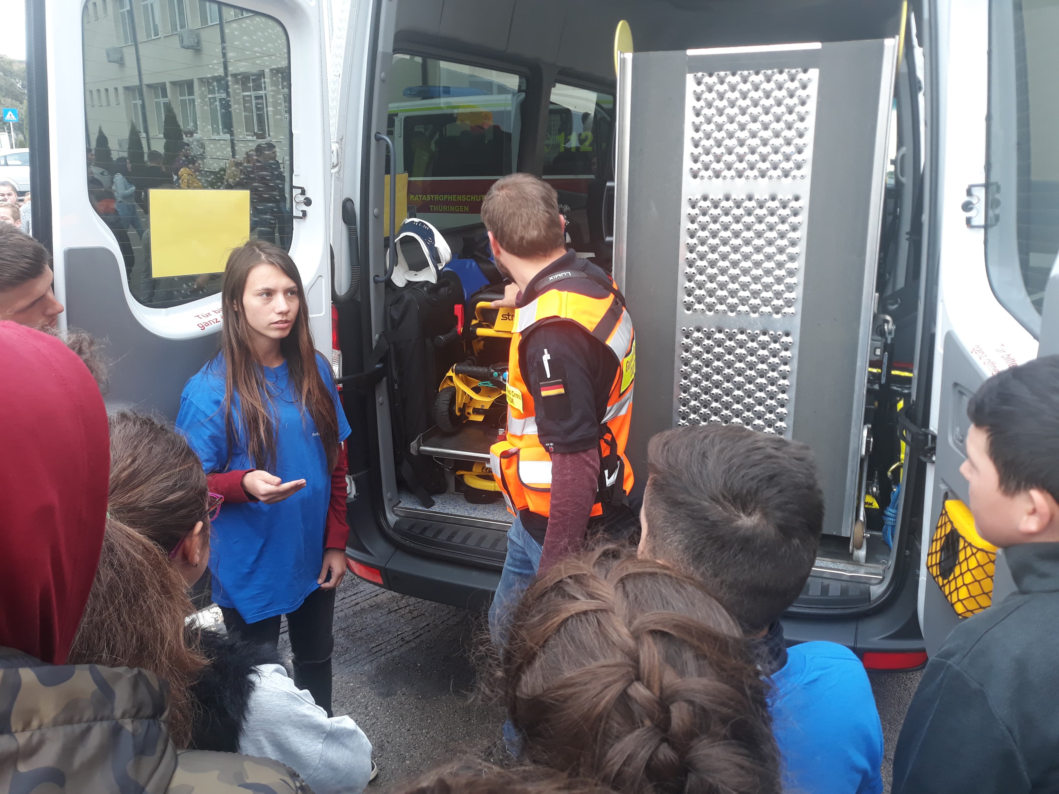 Acțiunea s-a desfășurat în curtea Liceului ” Demostene Botez” Trușești, lăsând posibilitatea tuturor elevilor curioși să observe autoutilitarele și să afle dacă există vreo diferență în modul de intervenție în caz de urgență în Germania.