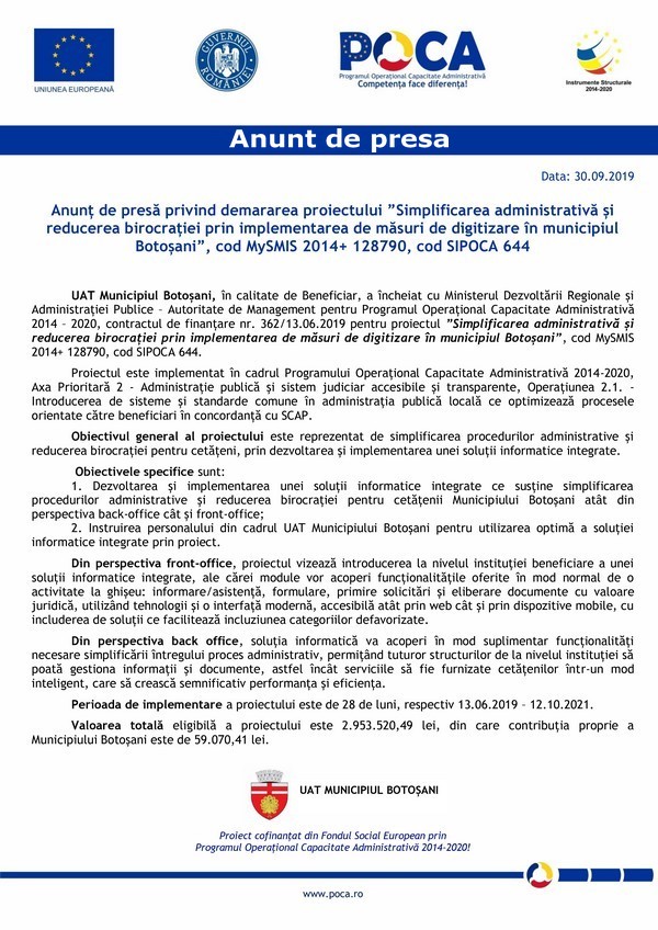 UAT Municipiul Botoșani, în calitate de Beneficiar, a încheiat cu Ministerul Dezvoltării Regionale și Administrației Publice – Autoritate de Management pentru Programul Operațional Capacitate Administrativă 2014 – 2020, contractul de finanțare nr. 362/13.06.2019 pentru proiectul ”Simplificarea administrativă și reducerea birocrației prin implementarea de măsuri de digitizare în municipiul Botoșani”, cod MySMIS 2014+ 128790, cod SIPOCA 644.