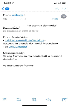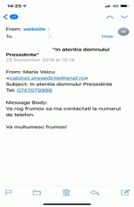 „Precizăm că nu există vreo persoanã cu numele Maria Voicu care să-și desfășoare activitatea la Cabinetul Președintelui. Pentru siguranța dumneavoastră, vă sfătuim sã nu deschideți aceste emailuri, iar dacã au fost deschise, sã nu urmați pașii descriși în acestea: sã nu apelați numãrul de telefon afișat/recomandat sau sã dați Reply la email”, anunță ANAF.