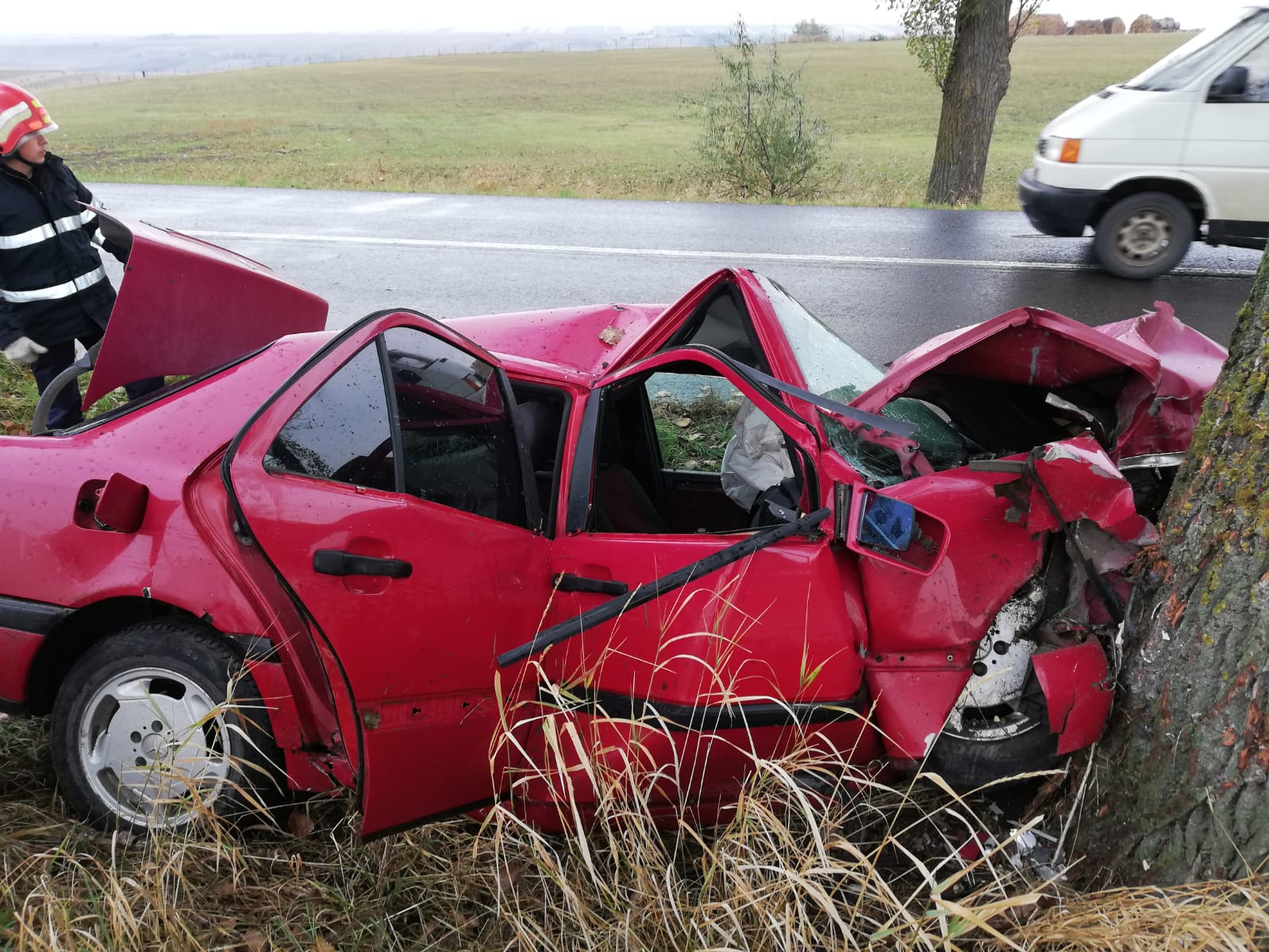 FOTO Accident! O mașină a intrat în copac. Inițial s-a spus că șoferul era încarcerat, dar polițiștii nu l-au găsit în mașină (UPDATE)