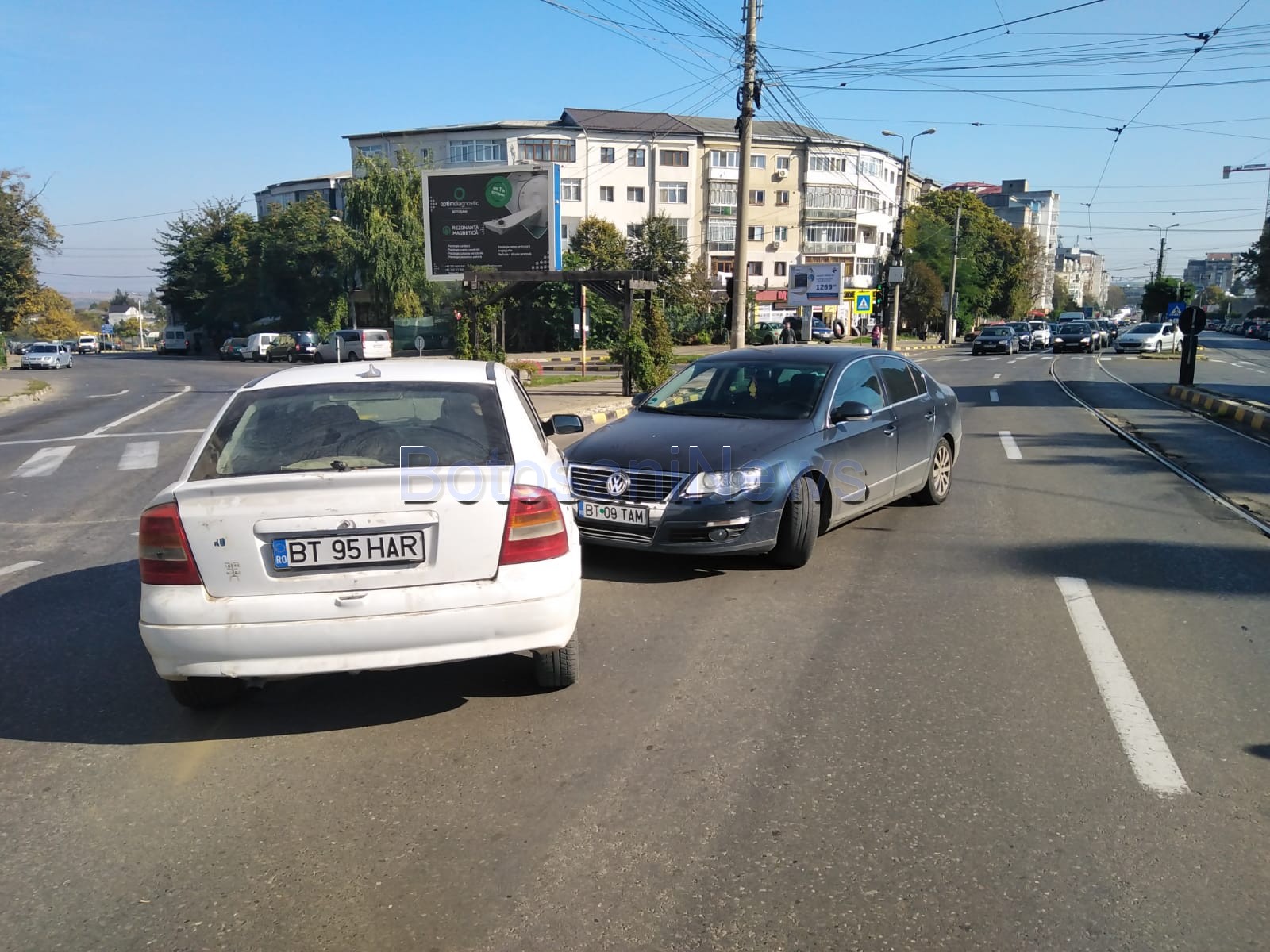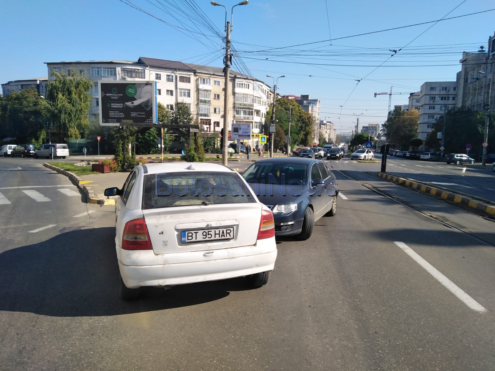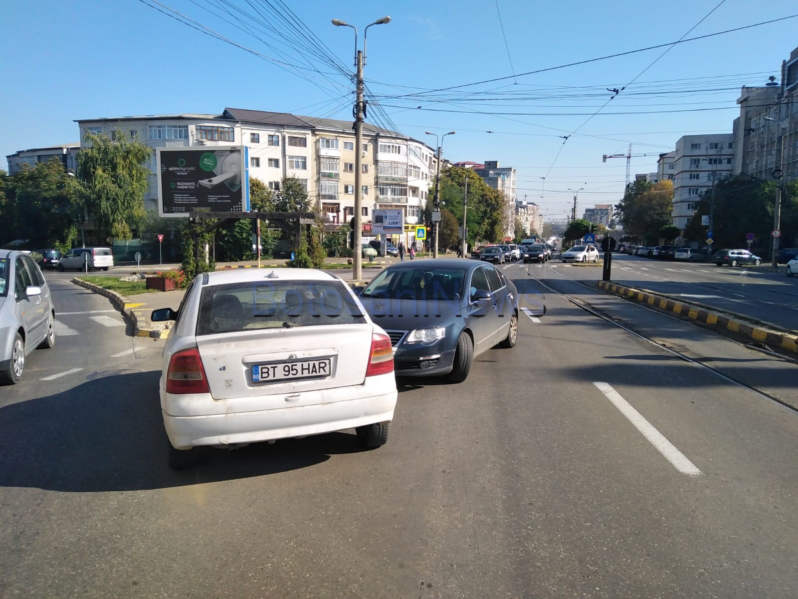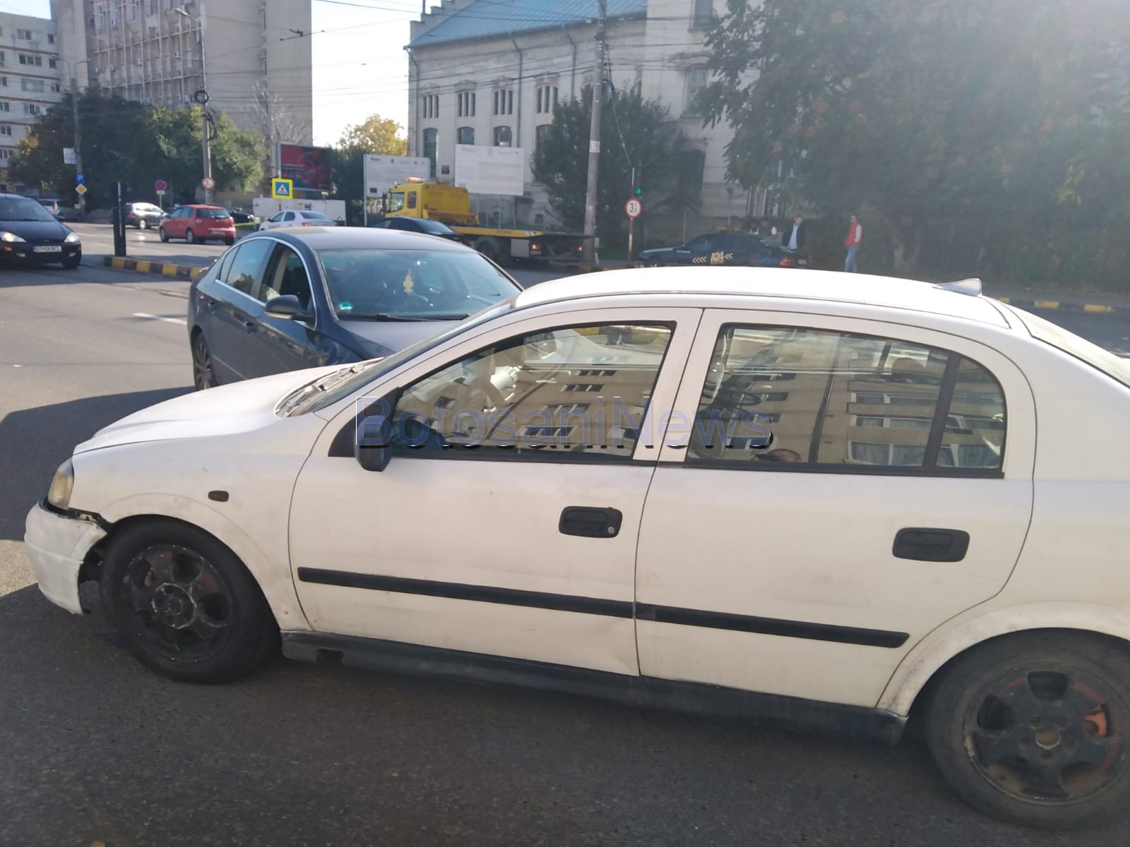 Un accident rutier a fost produs, marți, în municipiul Botoșani, de o mașină fără șofer. Autoturismul era parcat în fața Bisericii Petru și Pavel, iar la un moment dat, probabil nefiind trasă frâna, a luat-o la vale și a intrat pe contrasens unde a lovit un alt autoturism, al cărei șofer se afla la semafor, în intersecție.