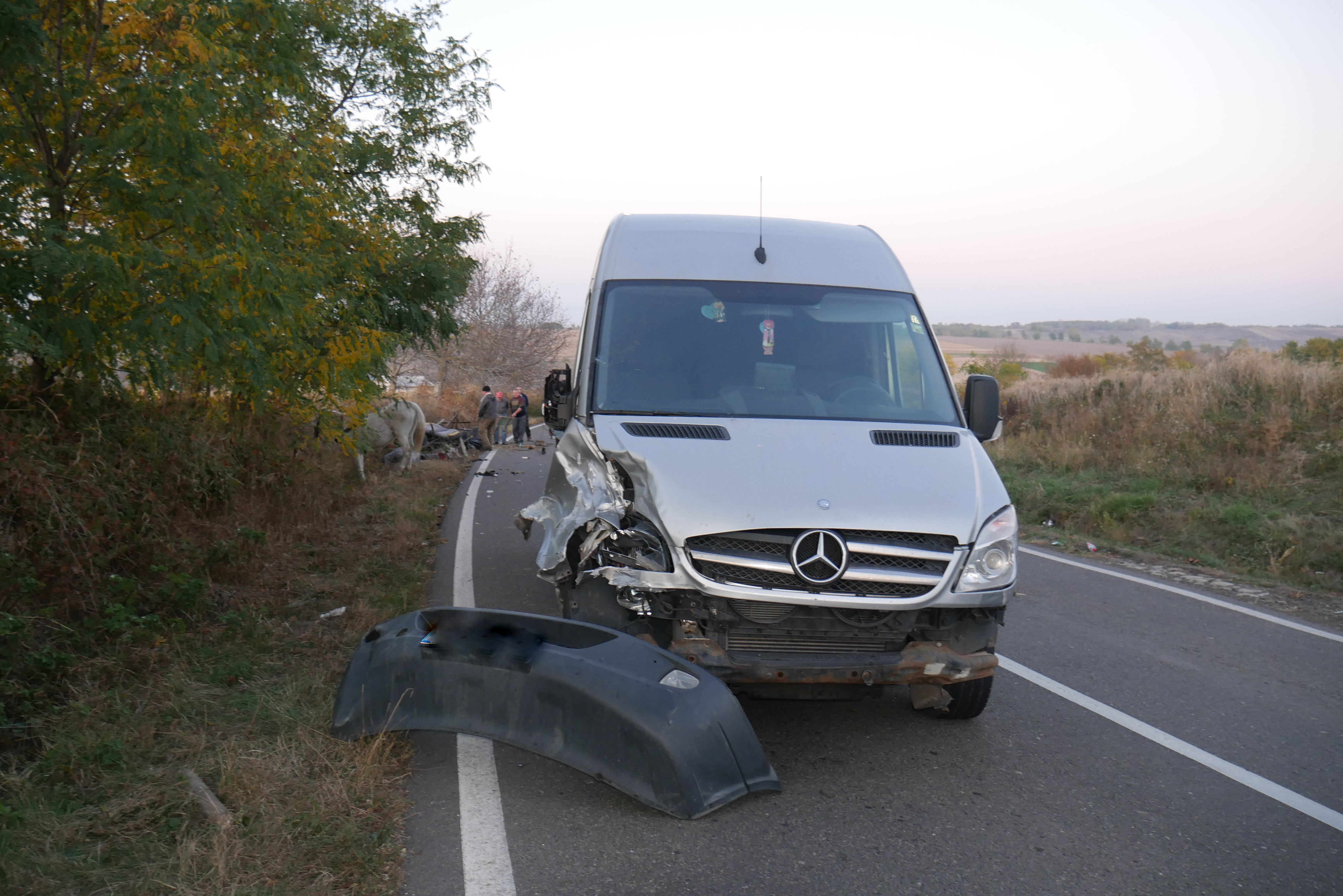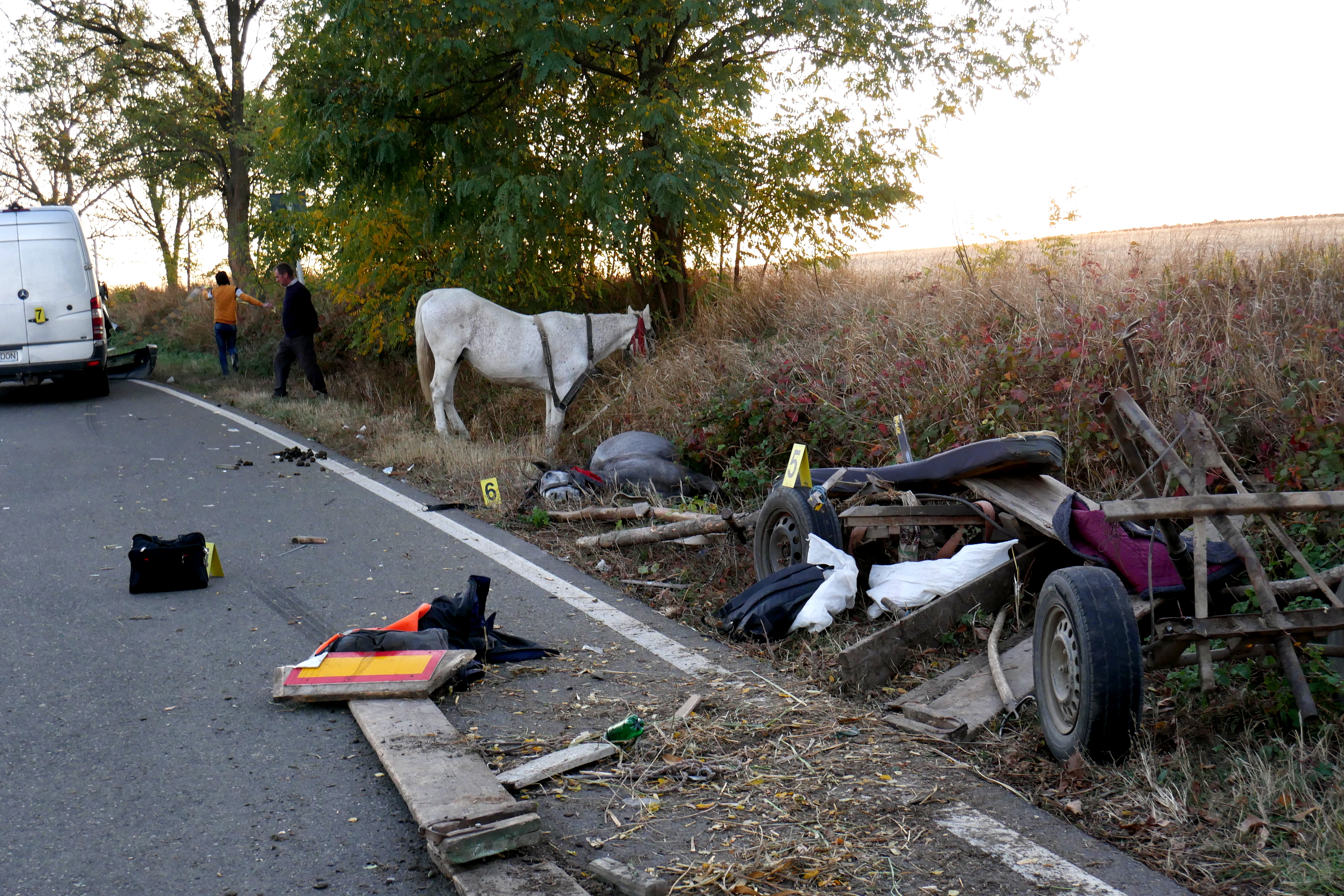 Venea de la vale, avea viteză. L-am observat, i-am făcut semn, a pus frână și a intrat în noi. A aruncat calul în față iar noi ne-am trezit sub mașină. În căruță eram două persoane. Un cal a decedat. Avea viteze, 100-110 km/h. A încercat să ne depășească, venea o mașină din față și nu a mai avut timp. Noroc că noi eram mult pe margine”, a spus căruțașul.