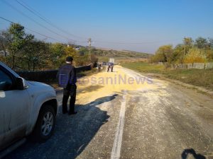 Circulația pe drumul național 29 D, care face legătura între Botoșani și Ștefănești, este îngreunată după ce mai multe tone de cereale s-au împrăștiat pe carosabil.