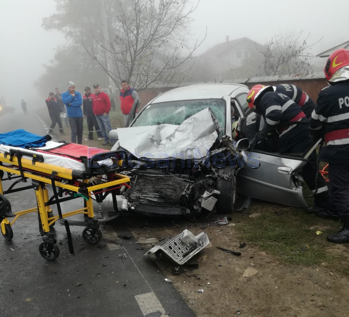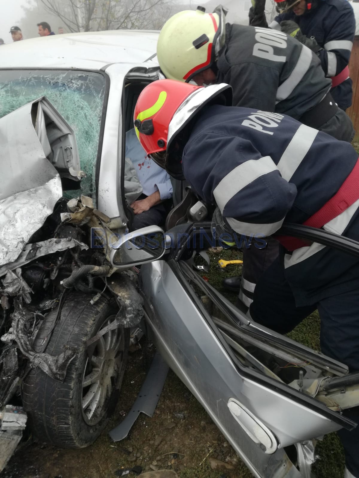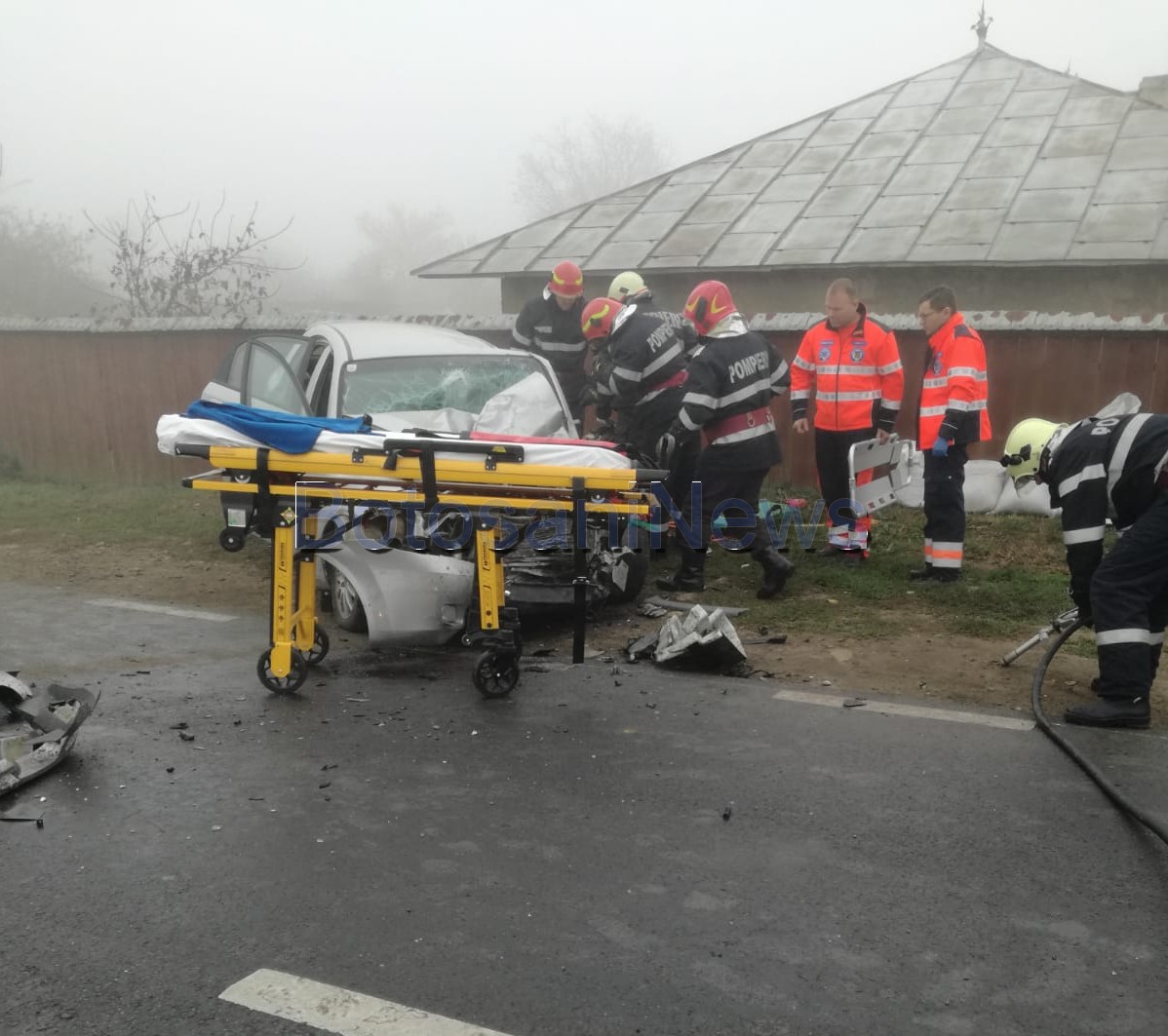 Femeia a ieșit singură din mașină, dar bărbatul, care conducea autoturismul, a rămas încarcerat, fiind nevoie de intervenția pompierilor pentru scoaterea sa.