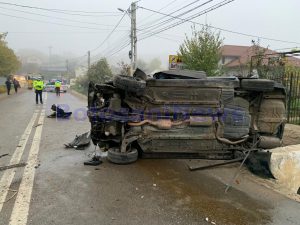Autoturismul, un Volvo, era condus de un tânăr de 20 de ani. Acesta pierde controlul asupra direcției de mers, lovește un cap de pod și se răstoarnă pe partea carosabilă.