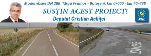 Deputatul PNL Cristian Achiței susține că modernizarea Drumului Național DN28B Tg. Frumos-Botoșani este o „investiție în continuare”. El susține că așteaptă finalizarea licitației de proiectare și execuție și dă asigurări că modernizarea acestui drum rămâne principalul obiectiv al mandatului său.