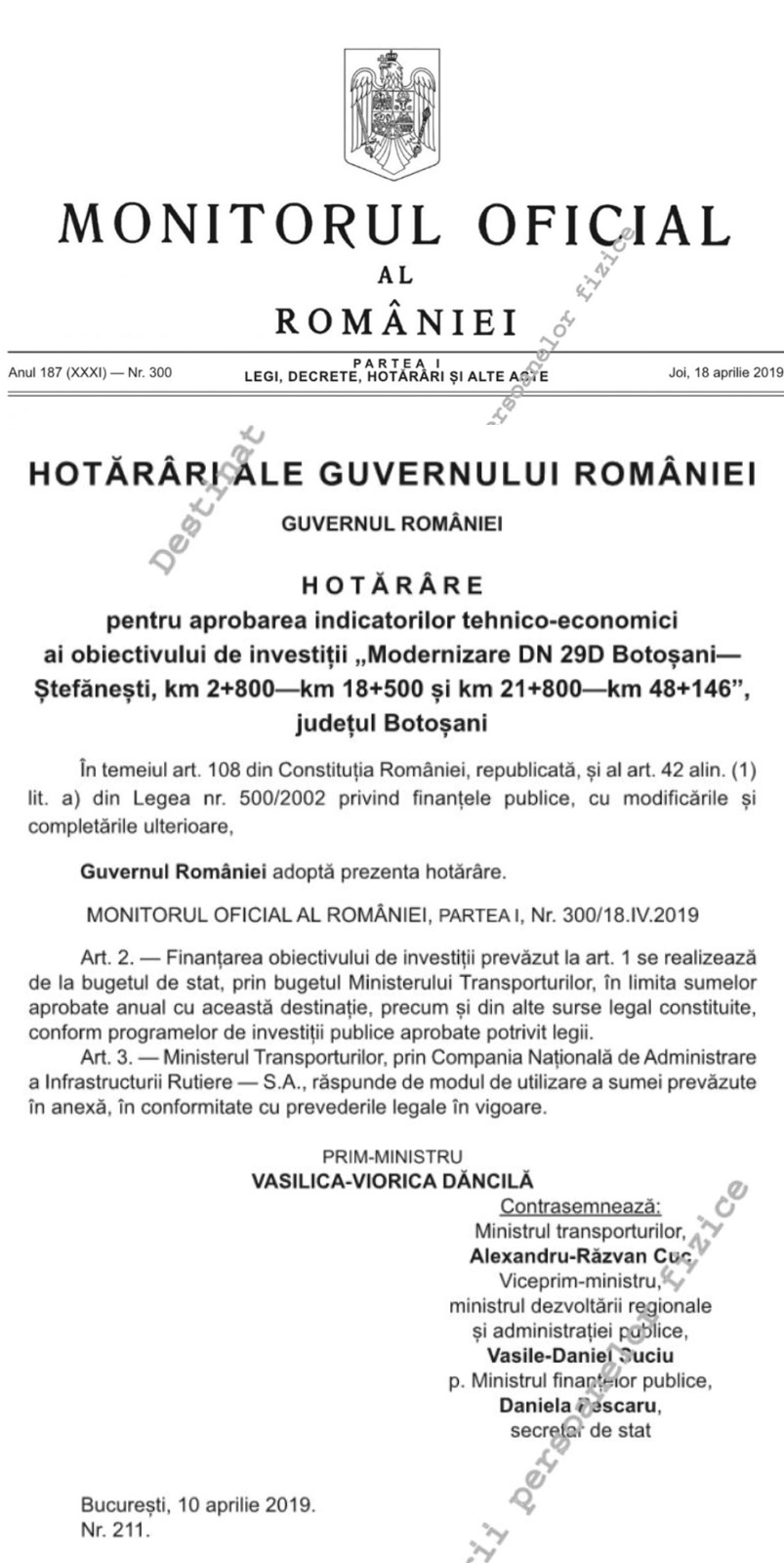Reprezentanții PSD Botoșani au prezentat dovada video a aprobării Hotărârii de Guvern adoptată în ședința din 10 aprilie 2019, semnată de Viorica Dăncilă și publicată în Monitorul Oficial nr. 300 din 18 aprilie 2019 în care este aprobată finanțarea pentru modernizarea drumului Botoșani-Ștefănești DN29. În urmă cu câteva zile, Compania Națională de Administrare a Infrastructurii Rutiere a anunțat că s-au încheiat procedurile de evaluare și a fost stabilit un constructor pentru refacerea drumului național DN 29D, Botoșani – Ștefănești.