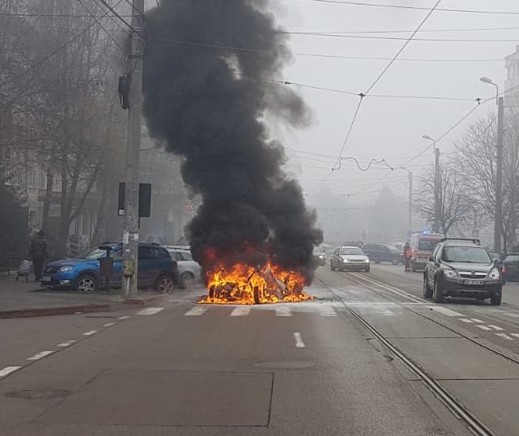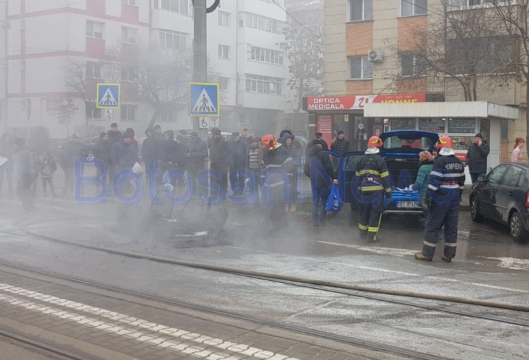Mașina cuprinsă de flăcări, marți, pe o stradă din municipiul Botoșani, a fost distrusă în totalitate. Autoturismul rula pe strada Ion Pillat, dinspre Luceafărul către Calea Națională, iar la un moment dat a fost cuprins de flăcări.