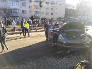 Șoferul de pe Porsche pierde controlul volanului și ajunge pe trotuar, unde lovește o femeie de 29 de ani și un copil de 5 ani.