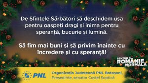 Mesajul organizației județene PNL Botoșani cu prilejul sărbătorilor de iarnăDistribuie:WhatsAppTweetTelegramReddit 23 decembrie 201923 decembrie 2019 De Sfintele Sărbători, să deschidem ușa pentru oaspeți dragi și inima pentru speranță, bucurie și lumină. Să fim mai buni și să privim înainte cu încredere și speranță! Organizația Județeană PNL Botoșani, președinte senator Costel Șoptică Distribuie:WhatsAppTweetTelegramReddit