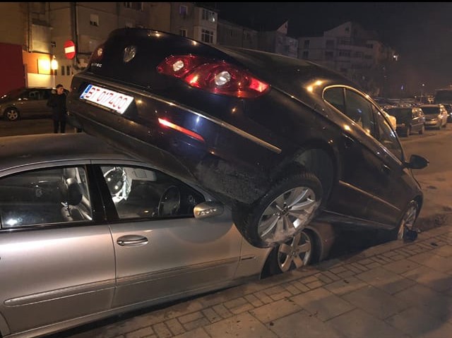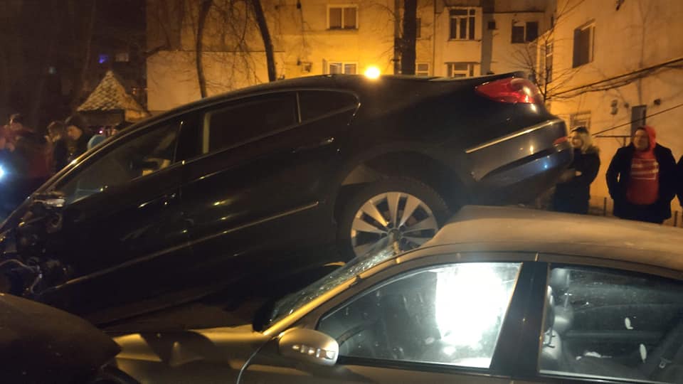 Una dintre cele patru mașinile avariate, un Volkswagen, a fost efectiv aruncată deasupra unei alteia, un Mercedes Benz, parcate în spatele său.