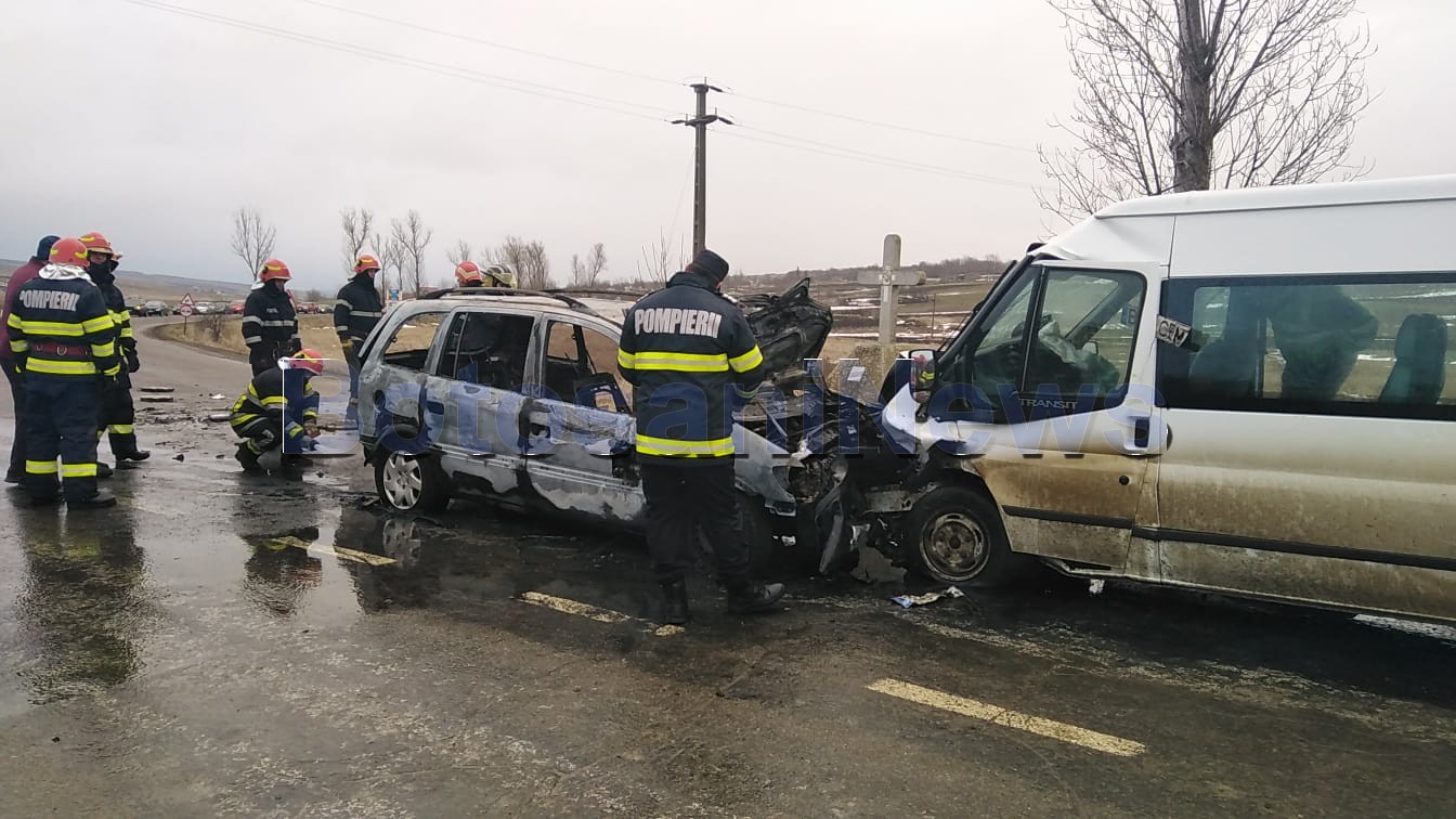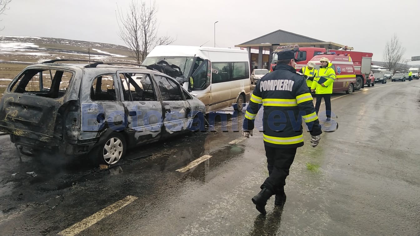 În accident au fost implicate în total 13 persoane, după ciocnirea dintre două mașini și un microbuz. Una dintre mașini a luat foc după impact.