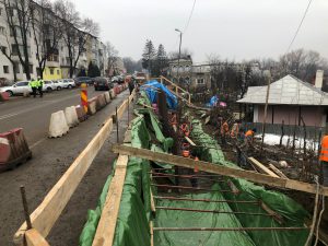 Este vorba de strada Împărat Traian, acolo unde se lucrează la construirea unui zid de sprijin, după ce anul trecut o bucată din trotuarul stradal s-a surpat din cauza inundațiilor.