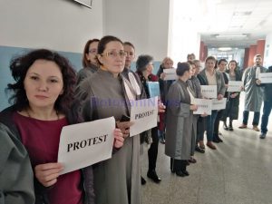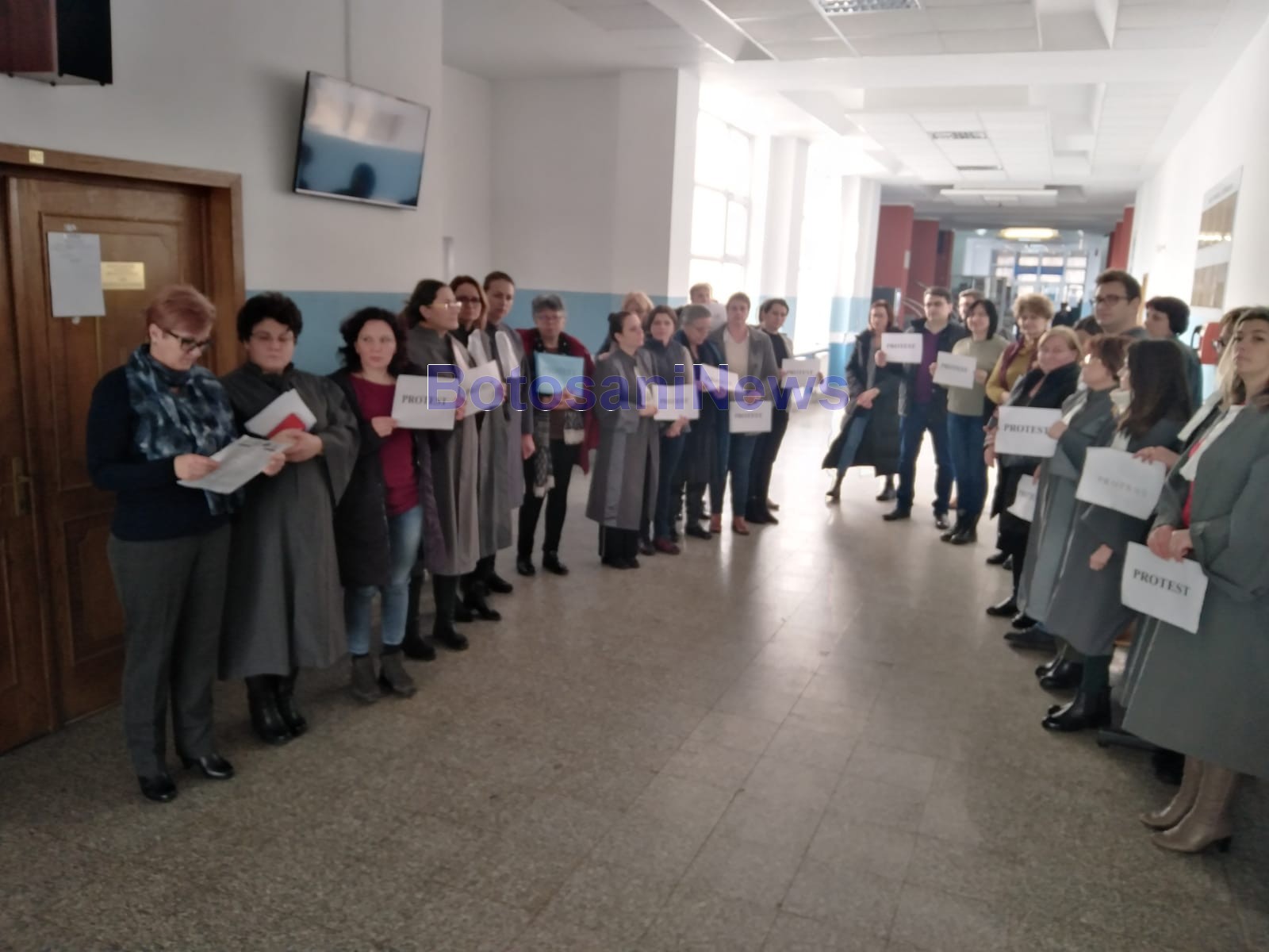 Grefierii botoșăneni au protestat, luni, pe holul instanței, între orele 10.00 și 12.00. Aceștia și-au întrerupt activitatea, nemulțumiți de abrogarea pensiilor de serviciu.