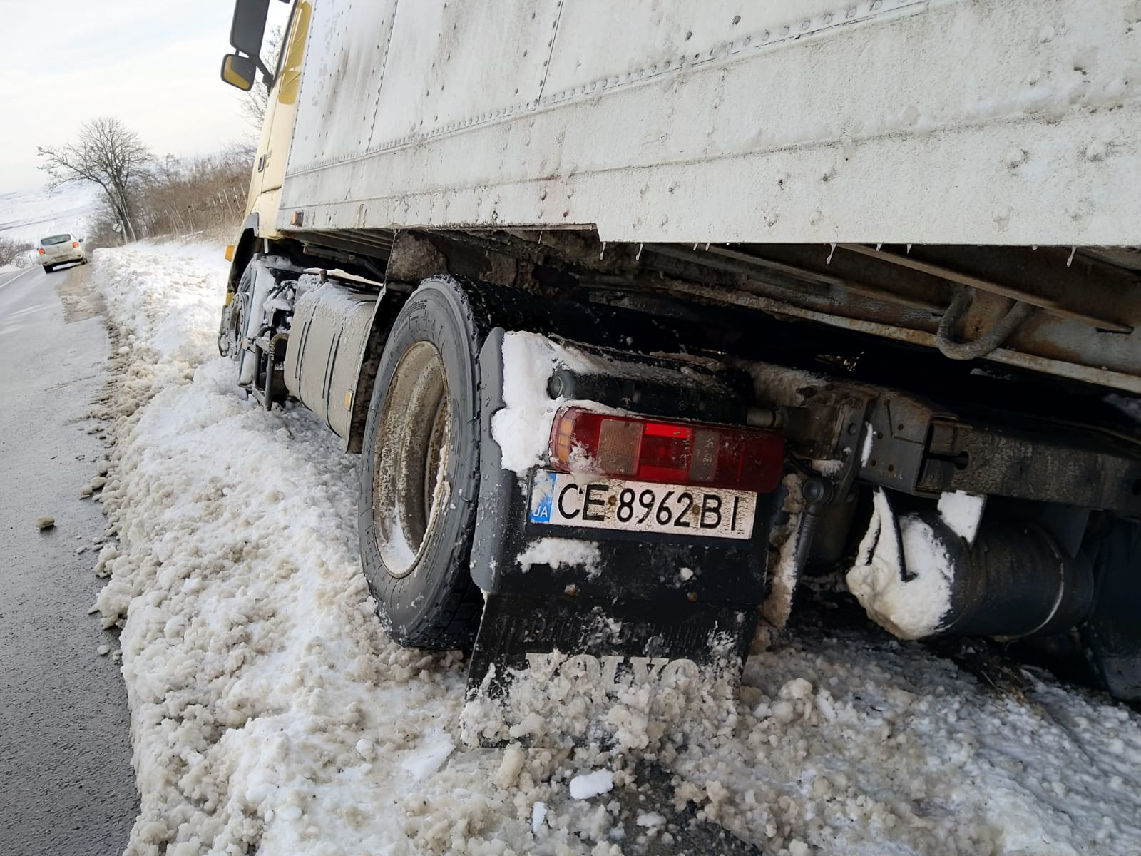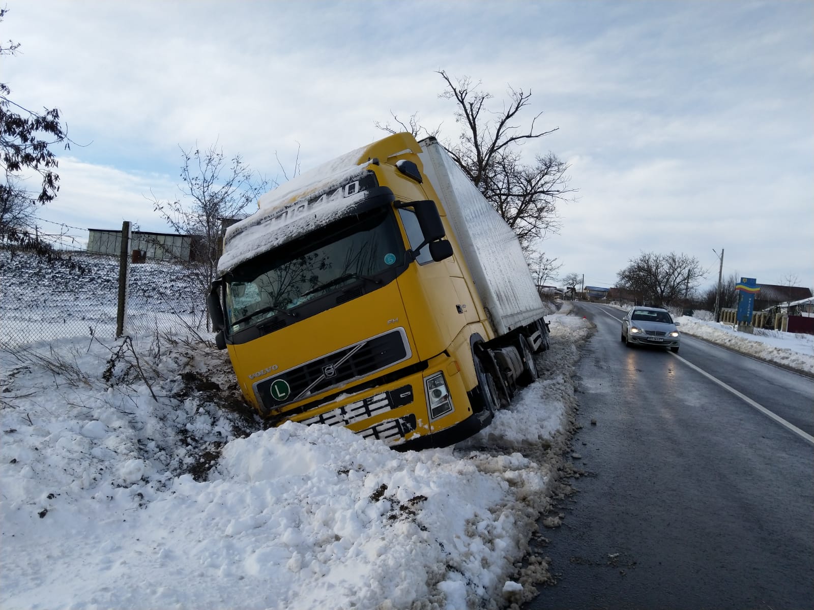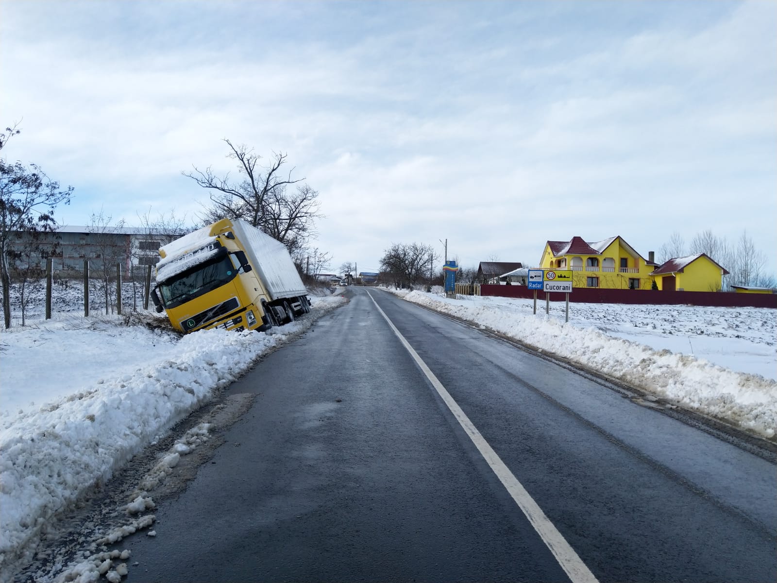 La fel s-a întâmplat și la Cucorăni, acolo unde un camion înmatriculat în Ucraina a ieșit de pe carosabil. El a rămas acolo peste noapte, proprietarul refuzând ca tirul să fie tras, ci a așteptat o macara pentru a fi scos din șanț.