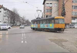Un tramvai a deraiat, sâmbătă la amiază, în zona Luceafărul din municipiul Botoșani. Reprezentanții Eltrans intervin pentru a-l repune pe șine.
