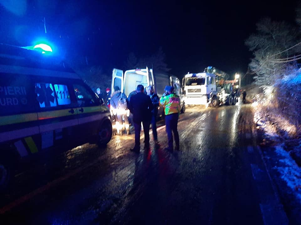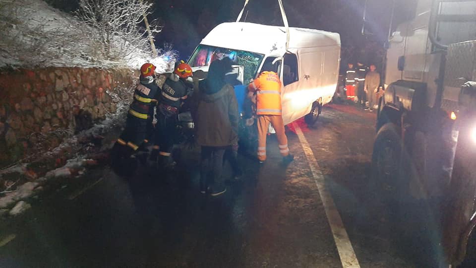 Din cauza poleiului, autoturismul a derapat şi a ajuns în albia pârâului. Cele nouă persoane au reuşit să iasă din microbuz până la venirea forţelor de intervenţie.