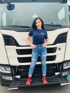 ”De mică am fost atrasă de meseriile bărbaţilor” Mălina Ghileschi a devenit şofer profesionist la începutul anului trecut, în luna ianuarie. Atunci s-a angajat la firma germană Spedition Pflaum Gmbh. Ca orice începător a lucrat o lună alături de logodnicul ei, un şofer experimentat. După această perioadă, vădind reale calităţi pentru condusul TIR-urilor, la numai 22 de ani, Mălina a primit propriul camion. Un Scania uriaş, de peste 40 de tone, cu o semiremorcă cu două axe. Tânăra botoşăneanca intra la o vârstă fragedă într-o lume dură a bărbaţilor, urmând să conducă mastodontul de zeci de tone pe drumurile Europei, singură. Pentru Mălina nu era însă ceva de speriat. Ne mărturiseşte că de mica a fost astrasă de meseriile bărbaţilor.