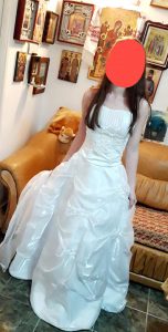 „Bănuții să fie donații în unul din conturile mamei cu dovada plății, iar apoi o voi trimite persoanei care o achită. Rochita a fost purtată o singură dată acum 5 ani, de o miresica care a dorit să rămână anonimă si s-o ajute pe Mihaela sa lupte cu boala. Pretul rochitei la vanzare pleaca de la suma de minim 1000 lei. Rochiță este albă, mărimea S-M compusă din 2 piese, fustita pe elastic, corset reglabil la spate, broderie fina in fata, are si voal inclus, lipsesc cele 3 cercuri metalice. Daca primesc mai multe oferte, persoana care v-a oferi cea mai mare suma de bani o va primi”.