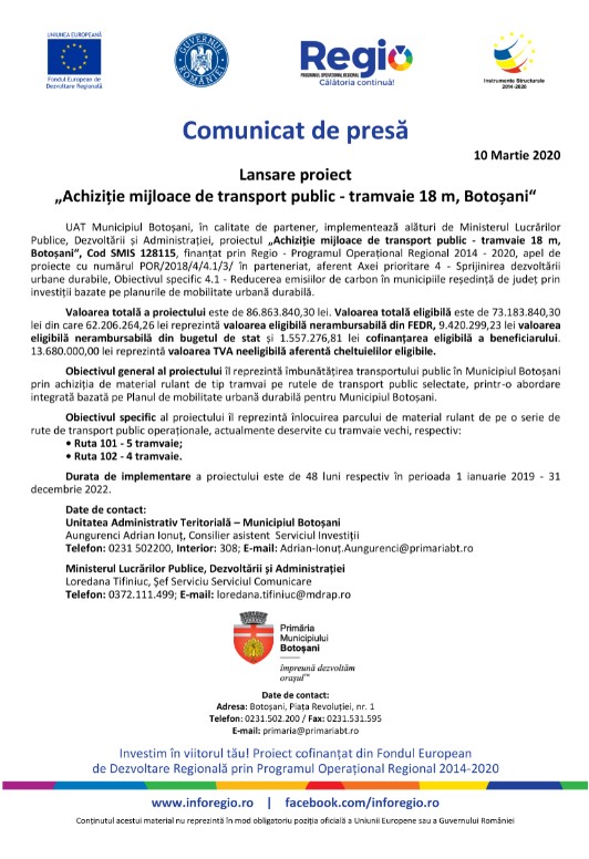 UAT Municipiul Botoșani, în calitate de partener, implementează alături de Ministerul Lucrărilor Publice, Dezvoltării și Administrației, proiectul „Achiziție mijloace de transport public – tramvaie 18 m, Botoșani“, Cod SMIS 128115, finanțat prin Regio – Programul Operațional Regional 2014 – 2020, apel de proiecte cu numărul POR/2018/4/4.1/3/ în parteneriat, aferent Axei prioritare 4 – Sprijinirea dezvoltării urbane durabile, Obiectivul specific 4.1 – Reducerea emisiilor de carbon în municipiile reședință de județ prin