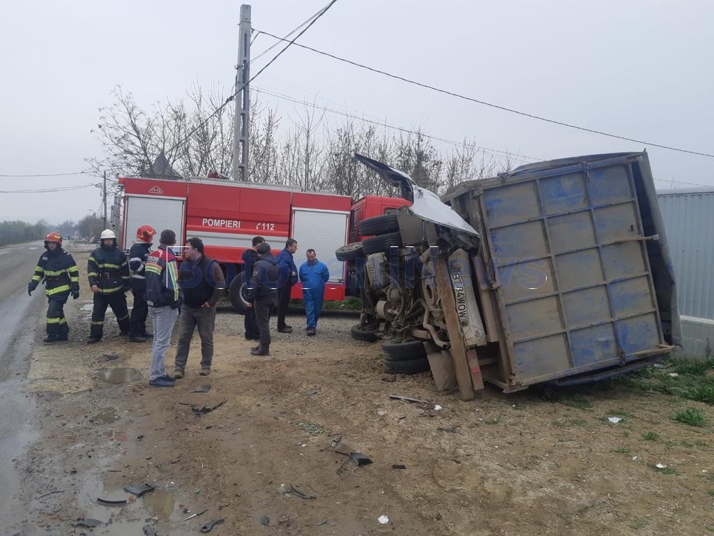 Pompierii au ajuns la fața locului pentru sablarea carosabilului, existând riscul scurgerii de carburanți din mașina răsturnată.