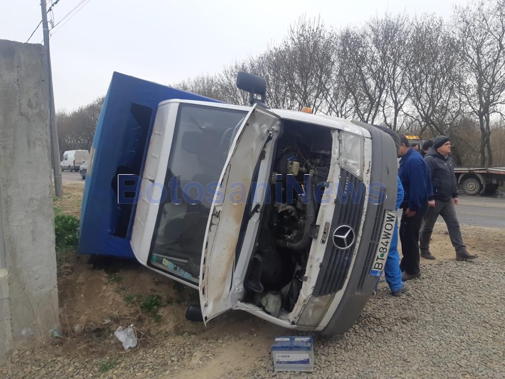 Un accident soldat doar cu pagube materiale a avut loc, sâmbătă, la ieșirea din Botoșani spre Stăuceni. O camionetă s-a răsturnat după ce a fost lovită violent de un autoturism BMW, care circula în același sens spre Ștefănești.