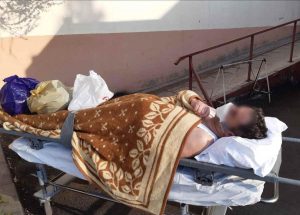 După cum se vede, peste el este pusă doar o pătură. Este legat cu bandă adezivă peste picioare. Trei sacoșe în care familia a apucat să îi pună câteva lucruri sunt și ele peste pacient.