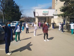 În timpul protestului, cadrele medicale au păstrat distanța între ele pentru a respecta măsurile impuse în cazul epidemiei de coronavirus.