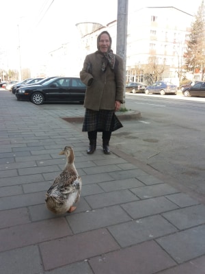 Iese la plimbare cu rățușca, o duce să pască iarbă și se bucură de oamenii care o privesc cu simpatie cum are grijă de micuța ei înaripată. Cât despre ceilalți care ridică sprânceana la obiceiul de a plimba rățușca, bătrâna nu-i bagă în seamă. Își iubește prea mult pasărea ca să mai pună la suflet și asta.