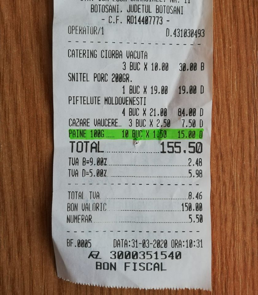 „Ieri, 31 martie 2020, am făcut o comandă la o Pensiune din Botoşani. Pentru noi şi pentru încă o persoană care, încadrându-se, cu diabet, într-o anume categorie de risc, nu îşi permite să iasă din casă. 155.50 lei.