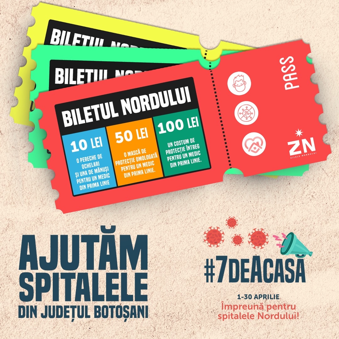 Detalii pe entertix.ro, care își donează toate comisioanele către această cauză, și zilelenordului.ro/7deacasa: https://www.entertix.ro/evenimente/5796/zilele-nordului-1-30-aprilie-2020-botosani.html