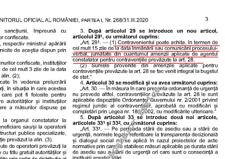 Ordonanța de urgență prin care sunt majorate amenzile pentru nerespectarea regimului stării de asediu și regimului stării de urgență a intrat în vigoare începând de vineri. Ea cuprinde un articol „surpriză” pentru contravenienți. Este vorba de articolul 3, care modifică articolul 28 din vechea ordonanță, și care spune că amenda minimă pe care o plătește contravenientul nu este jumătate din valoarea minimă a amenzii prevăzute de ordonanță, ci jumătate din cuantumul amenzii aplicate de agentul constatator.