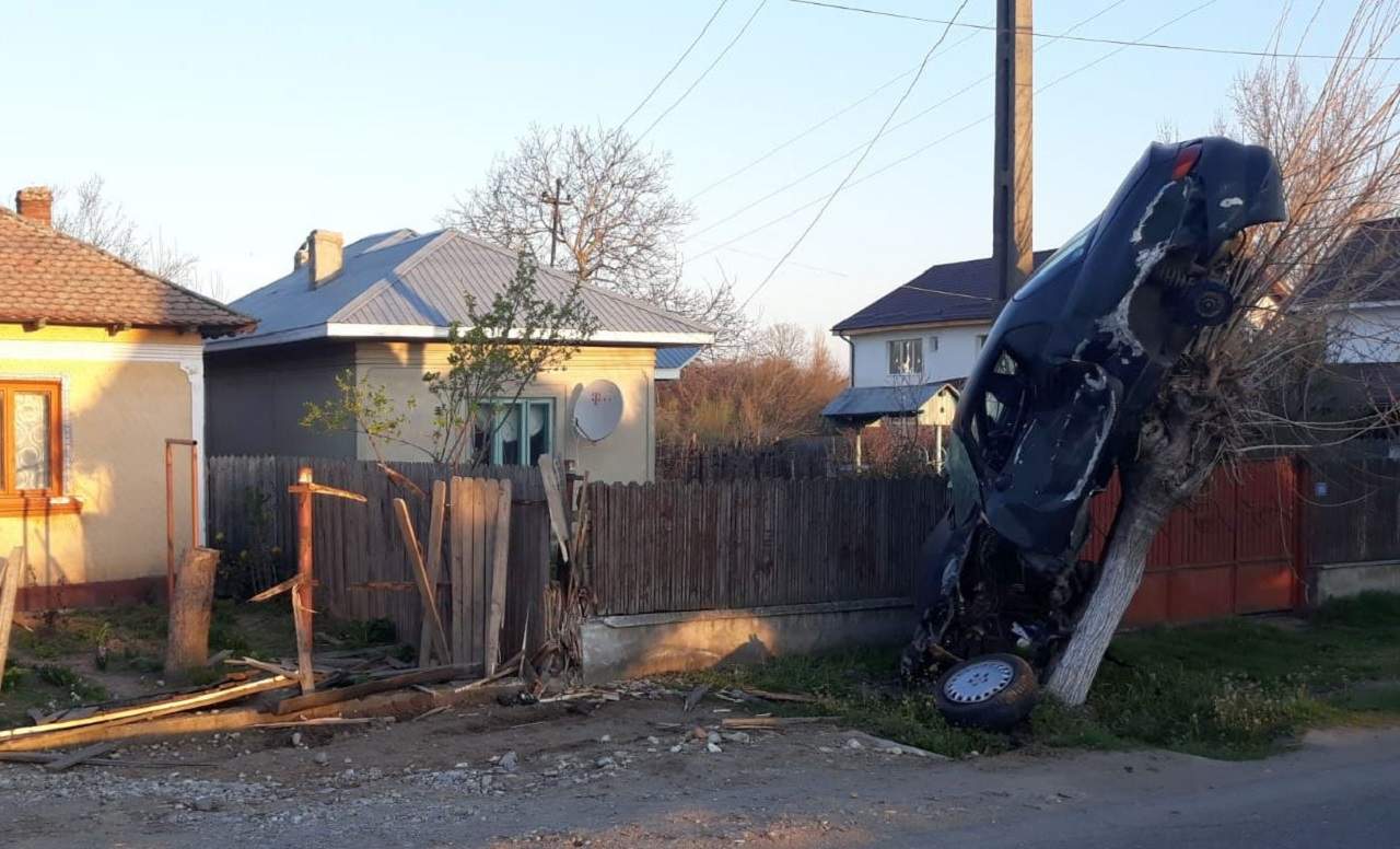 În accident a fost distrus și gardul unei gospodării, iar familia care locuia aici, dar și șoferul s-au ales cu o sperietură zdravănă.