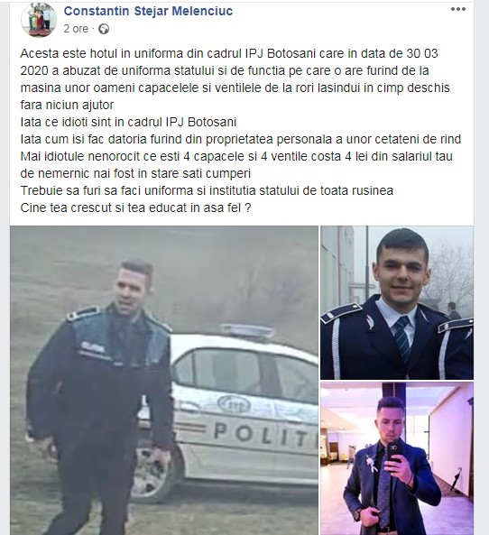 „Acesta este hotul in uniforma din cadrul IPJ Botosani care in data de 30 03 2020 a abuzat de uniforma statului si de functia pe care o are furind de la masina unor oameni capacelele si ventilele de la rori lasindui in cimp deschis fara niciun ajutor. Iata ce idioti sint in cadrul IPJ Botosani. Iata cum isi fac datoria furind din proprietatea personala a unor cetateni de rind. Mai idiotule nenorocit ce esti 4 capacele si 4 ventile costa 4 lei din salariul tau de nemernic nai fost in stare sati cumperi. Trebuie sa furi sa faci uniforma si institutia statului de toata rusinea. Cine tea crescut si tea educat in asa fel?”, a scris bărbatul pe contul său de Facebook, asociind textului și fotografii cu agentul în uniformă, dar și în civil.