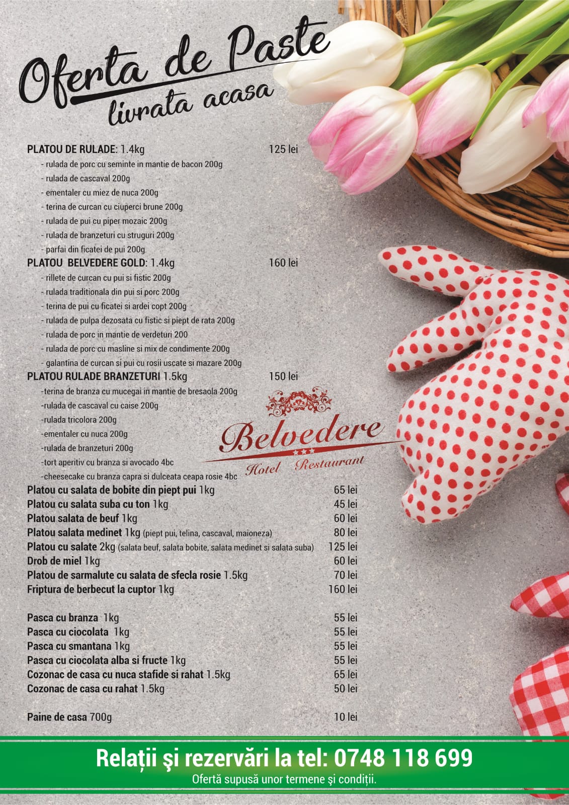 Restaurantul Belvedere din Botoșani a lansat o ofertă pentru masa de Paște. El livrează la domiciliu mâncare tradițională de la pască și sărmăluțe până la drobul de mier sau friptura de berbecuț.