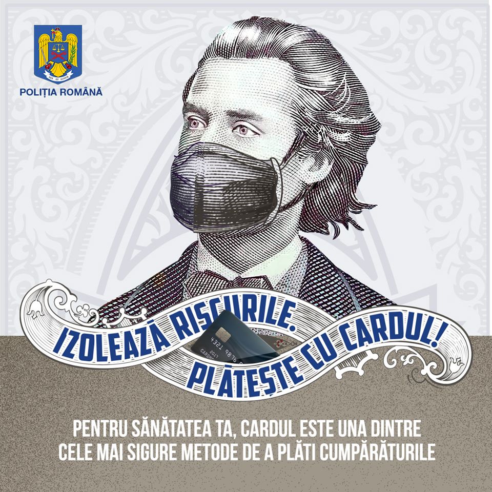 „În perioada COVID-19, recomandăm și distanțarea de cele mai populare chipuri din România: cele de pe bancnote. Ele trec prin zeci de mii de mâini înainte de a ajunge la tine. Pentru siguranța ta, alege plata cu cardul”, este mesajul Poliției Române.