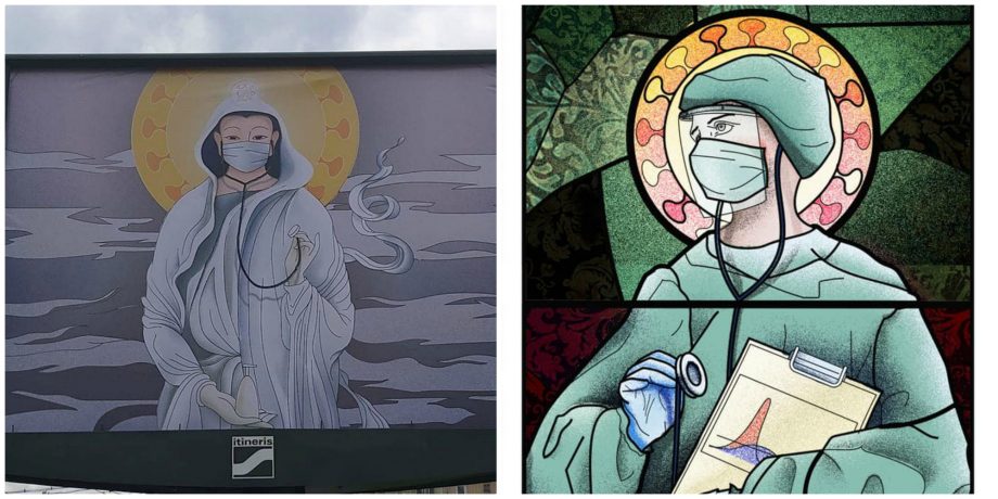 O artistă din București a creat o serie de ilustrații înfățișând medici cu aure și în posturi de sfinți. Imaginile fac parte dintr-o campanie derulată de o agenție de publicitate cu scopul de a le mulțumi celor care luptă în prima linie cu pandemia de COVID-19 și au fost expuse pe panourile publicitate din Capitală.