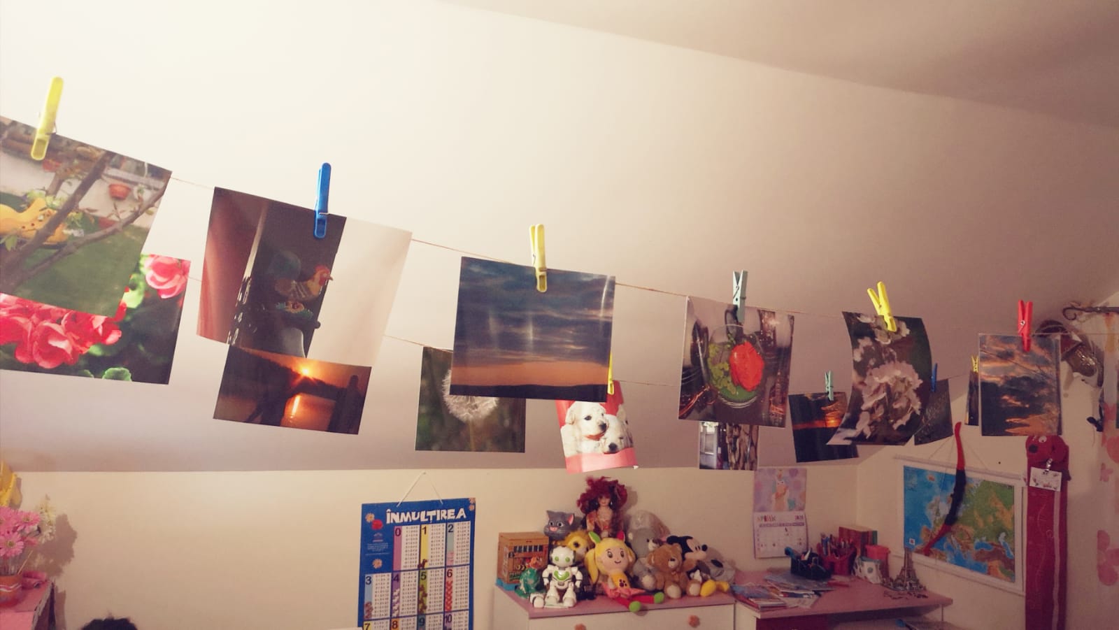 Fericită de rezultatul muncii sale, copila de nouă ani și-a expus toate fotografiile în camera sa.