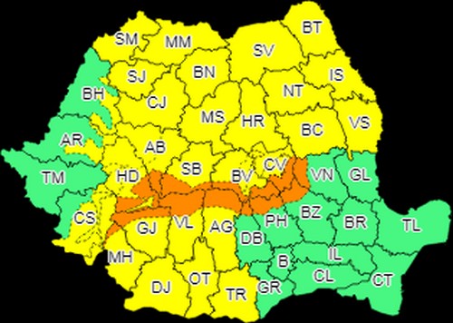 Local și temporar în nord, centru, est și sud-est va ploua moderat cantitativ și vor fi perioade cu manifestări de instabilitate atmosferică (averse ce pot avea și caracter torențial și descărcări electrice). În intervale scurte de timp sau prin acumulare, cantitățile de apă vor depăși 15…25 l/mp și punctiform 30 l/mp.