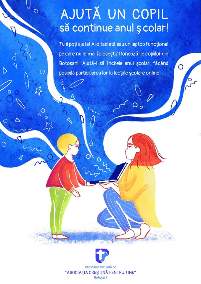 „Tu îi poți ajuta! Ai o tabletă sau un laptop funcțional pe care nu le mai folosești? Donează-le copiilor din Botoșani! Ajută-i să încheie anul școlar, făcând posibilă participarea lor la lecțiile școlare online. Puteți de asemenea să donați în conturile Asociației Pentru Tine, iar noi vom folosi toți banii pentru a cumpăra laptopuri sau tablete copiilor. Pe lângă aparatura tehnică, Asociația îi va ajuta tot online cu temele și vor desfășura și alte activități educative. Dacă doriți să ne scrieți, o puteți face pe [email protected]. Laptopurile și tabletele pot fi trimis la adresa: Str. l. C. Brătianu, nr. 104, Jud. Botoșani, Mun. Botoșani. Pentru donatori – putem trimite într-un mesaj privat imagini cu copilul care a beneficiat de laptopul/tableta donată!”, susțin reprezentanții asociației.